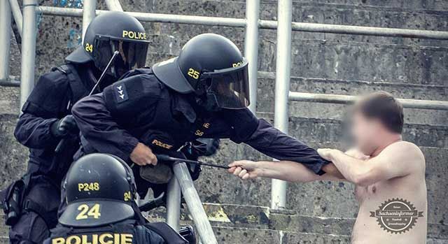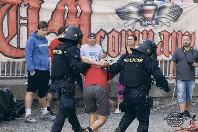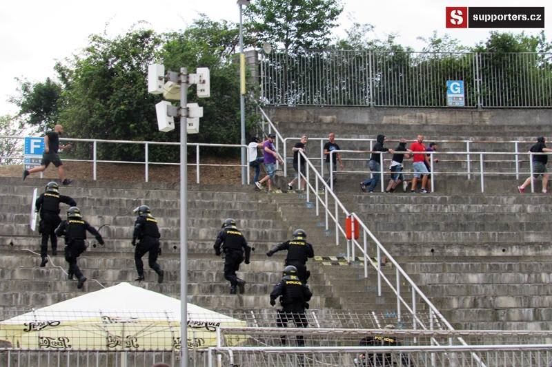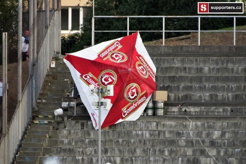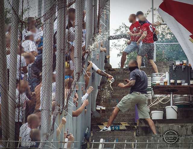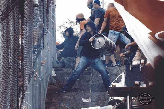 Po vytažení nápisu přichází reakce ze strany domácích, kteří překonávají provizorní bariéru, která má vytvářet bezpečnostní zónu a rázem se lomcuje s ploty a narychlo opuštěný stánek s občerstvením se stává logistickým centrem a ukázkou fungování maloobchodu a velkoobchodu. Zatímco od Chacharů lítají kelímky s pivem, tak ze strany Brna dochází k naskladňování piva v celých bečkách... Předčasně odstartovaný oktoberfest ukončuje až policie.