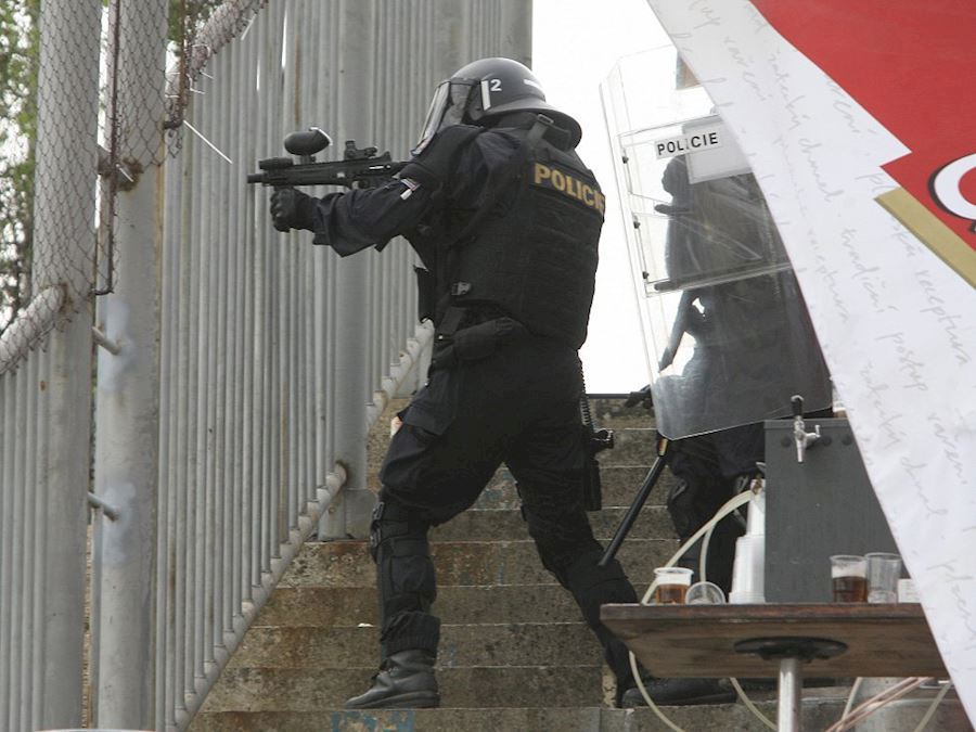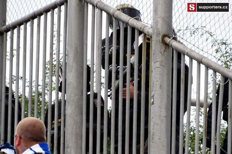 Z REPORTU CHACHARŮ: Byl také vytažen transparent "Autoservis CHzB", reagující na výjezd Brna do Karviné, kdy mechanici z řad Baníku, udělali tuningovou úpravu exteriéru a interiéru na autech Zbrojováků. O poločasové pauze pak domácí přišli tuning vyreklamovat, proběhla menší šermovačka u plotu, kde nad reklamačním řádem debatovalo několik desítek lidí několika národností, reklamace ovšem nebyla uznána a všechno ukončují četníci.