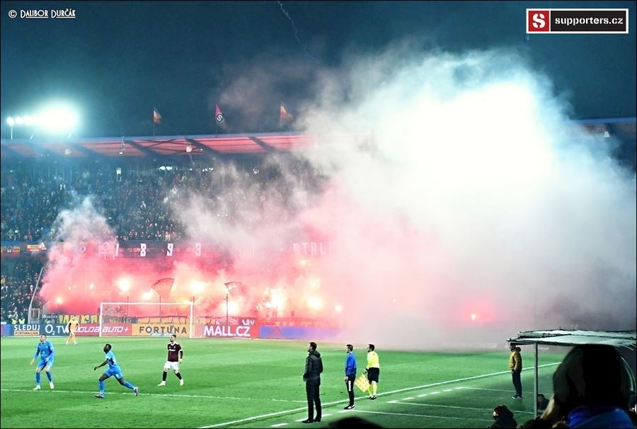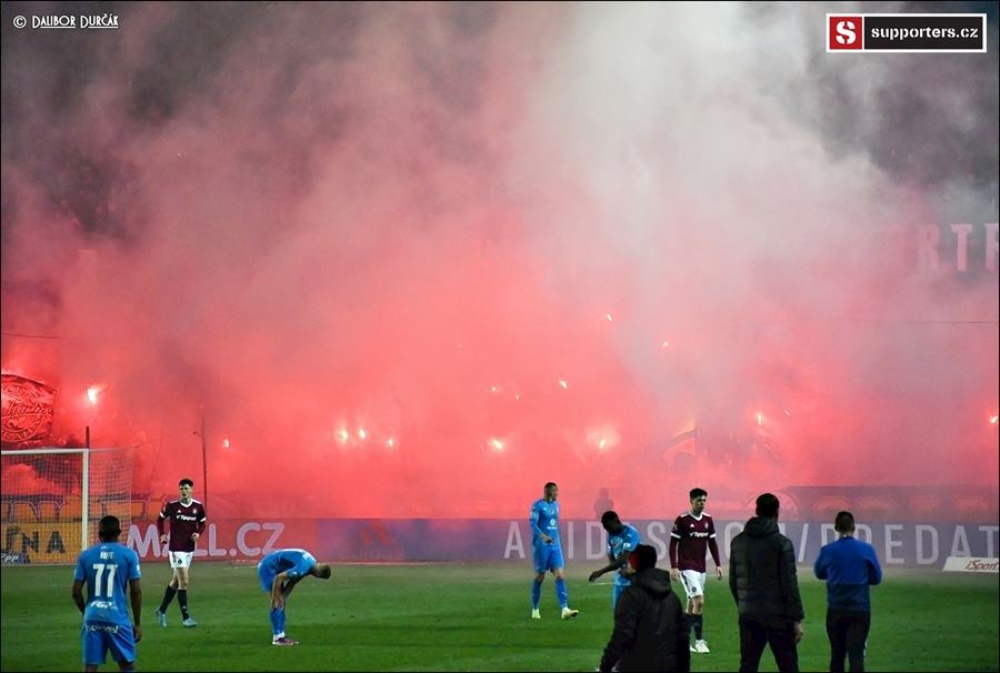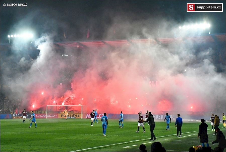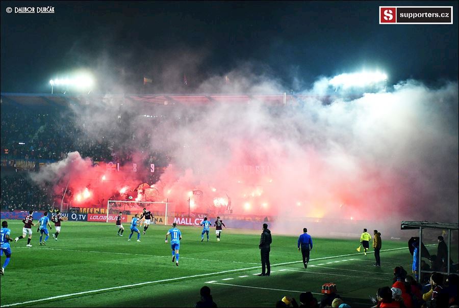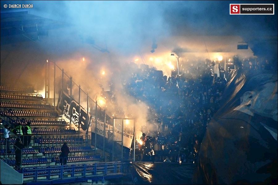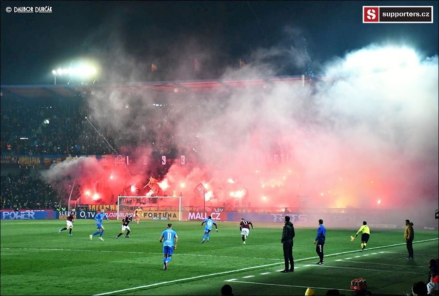 Oba tábory se na utkání připravili a tak jsme byli svědky choreí i pyrotechniky na obou stranách.