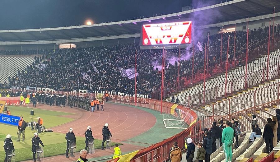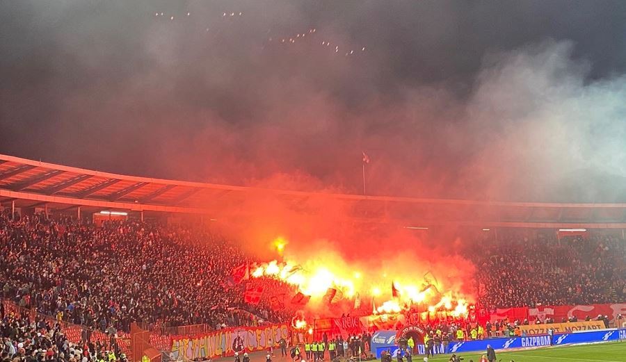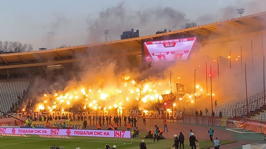 V centru města proběhl oběd s vynikajícím čepovaným Jelenem, na který jsem se ty roky tak těšil, prohlídka tvrze Kalemegdan na soutoku Dunaje se Sávou a následně přesun zpět do blízkosti stadionu. To už je celé okolí obšancováno obrovským množstvím policajtů, kteří regulují dopravu a tok fanoušků. Do útrob se dostáváme zhruba hodinu před utkáním, je spousta času, tak mířím rovnou do bufetu. Ten mě překvapuje svým sortimentem. Krom nealko piva a sladkých nápojů je možno pořídit i párek v rohlíku, popcorn a ještě něco dalšího sladkého na zub. Oproti bufetu na Partizanu, kde bylo na výběr z trojice nealko pivo, Cola a Fanta se jedná o kulinářské gastroporno. Obsluze to moc nejde, beru si tedy jen colu za 250 dinárů a jdu na své místo. To se nachází přesně na polovině hřiště ve třinácté řadě. Jedná se o bezchybně zvolenou pozici k pozorování Delije, Grobarů a také dění na hřišti. Na své sedačce jsem měl předem připravený igelit, který dával tušit, že zápas otevře celostadionové choreo. Cirka 40 minut před utkáním na terén vybíhají hráči Partizanu, kteří jsou od pomalu se plnících ochozů “přivítáni“ první rundou bučení a nadávek. Ti místo začátku rozcvičky běží rovnou pod sektor hostů, kde se navzájem hecují a společně přidávají pár pokřiků a chorálů. Tento jev pozoruji s velkým zaujetím a mám radost, že hráči jsou na zápas maximálně vyhecovaní. Sluší se napsat, že právě Partizan je klub, který mám v Srbsku a celkově na Balkáně zdaleka nejraději. Do začátku zápasu z repráku zní songy oslavující Crvenou Zvezdu a jelikož její hráči se rozcvičují na vedlejším hřišti, moc se toho neděje. Čtvrt hodiny před utkáním jdou hosté za ohromného pískotu zpět do kabin a tribuny začínají být velmi dobře zaplněné.