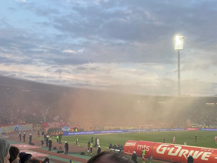 Před začátkem druhé poloviny domácí odpalují první větší nálož pyrotechniky. Svůj sektor rozsvicují díky desítkám rací do rudé barvy. Ne dlouho s pyrotechnickou vložkou čekají i hosté, jenž se prezentují velkým množstvím světlic žluté barvy, které dávají skvělý efekt. Hoří celý sektor. Z něj však po chvíli začnou světlice létat na policii stojící na tartanu za brankou. Několik světlic se rozhořelo i v druhém sektoru Partizanu. Jedna z nich letí až na hřiště, avšak hraje se zrovna na druhé straně, tak se nepřerušuje. Po Grobarech svůj sektor znovu zapalují domácí. K velkému množství rudých rací přidávají ještě římské svíce, což dohromady dává skvělý efekt. Dlouhotrvající pyroshow se povedla. Ta měla za důsledek i jediné přerušení zápasu. Na hřišti se stále nic moc neděje. Tu a tam nějaká žlutá karta, střela pánubohu do oken a nesčetně pokažených přihrávek. I přesto má ke konci utkání Zvezda na hřišti rádoby tlak, letí pár centrů do vápna. Na to reaguje i zaplněná Marakana a žene hráče dopředu. Celý stadion zpívá společně s kotlem, neuvěřitelný fanatismus. Bohužel, na hřišti ani jeden gól nepadl. Hrát se dodnes, pravděpodobně je to stále 0:0. Tento výsledek ale lépe bere Zvezda, která má na úhlavního rivala dvoubodový náskok a pokud se nestane něco nepředvídatelného, tak jej do konce soutěže udrží. Hráči pod sektory děkují za podporu, dohoří poslední kousky pyrotechniky a my pomalu míříme ze stadionu k autu.