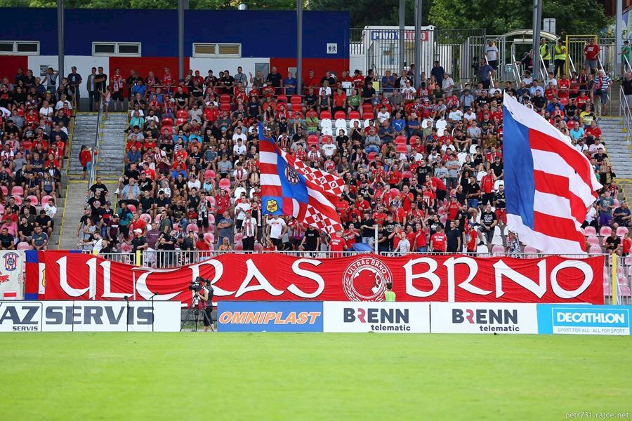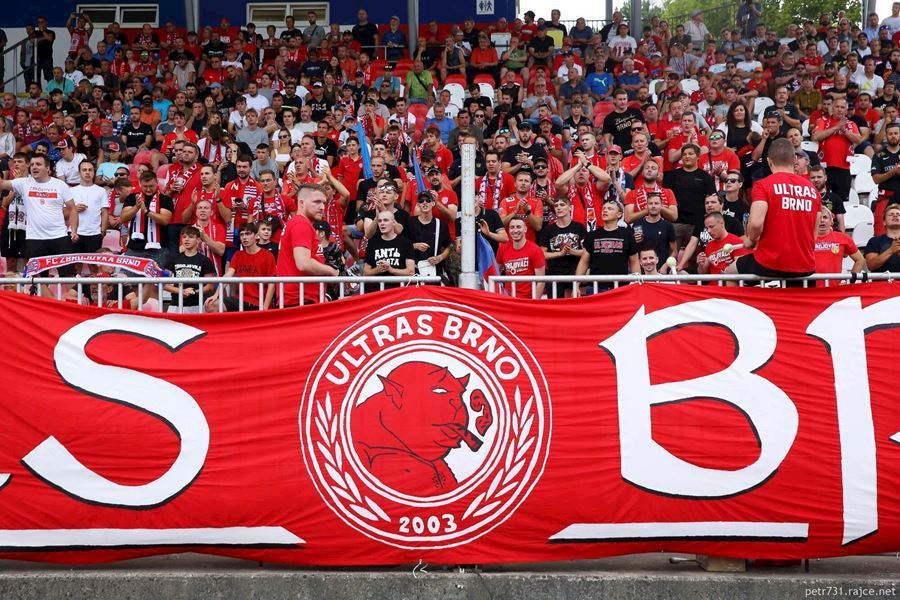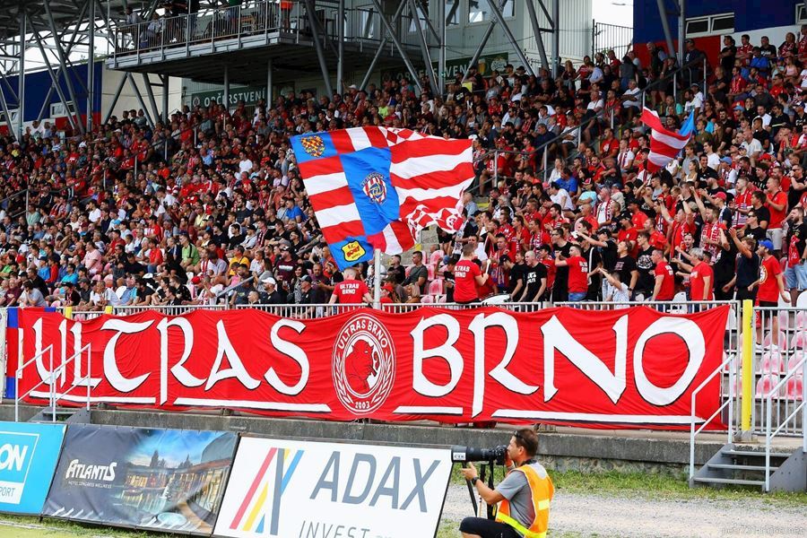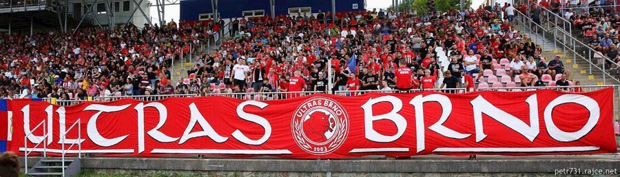 FB ZBROJOVÁCI: V kotli dnes měla premiéru naše nová (ručně malovaná) vlajka "Ultras Brno"! Nutno podotknout, že jsme si tu premiéru nemohli přát lepší. To je prostě start do ligy tak, jak se sluší a patří. Zbrojovka do toho!
