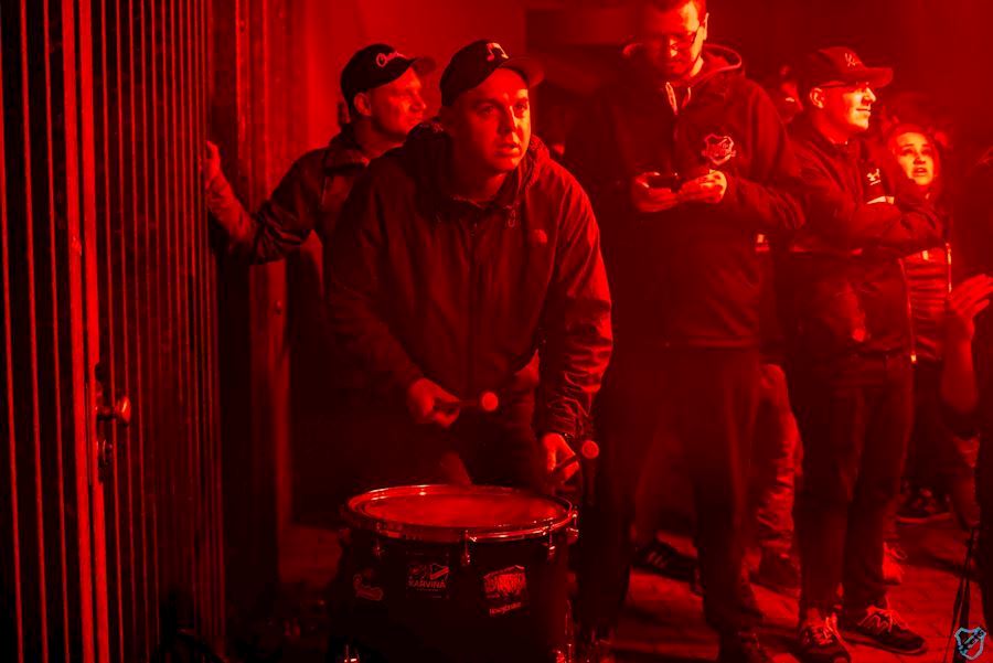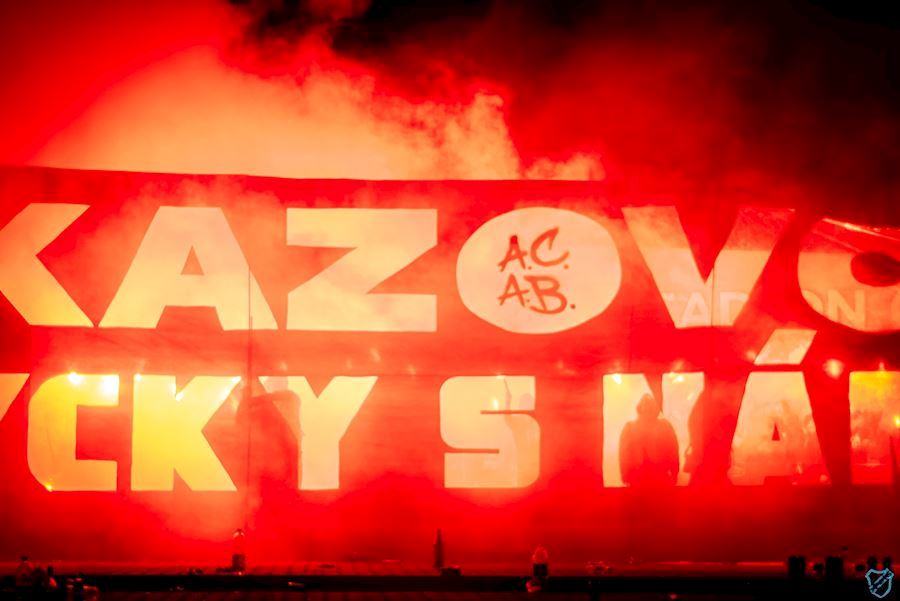 Zápas s Brnem orámovala pyroshow s ohňostrojem, která dala vyniknout prosvětlenému nápisu: “Zákazovci, vždycky s námi!” Tímto gestem jsme se rozhodli pozdravit všechny fanoušky Baníku, kteří musí trávit zápasy FCB nuceně na policejních služebnách...