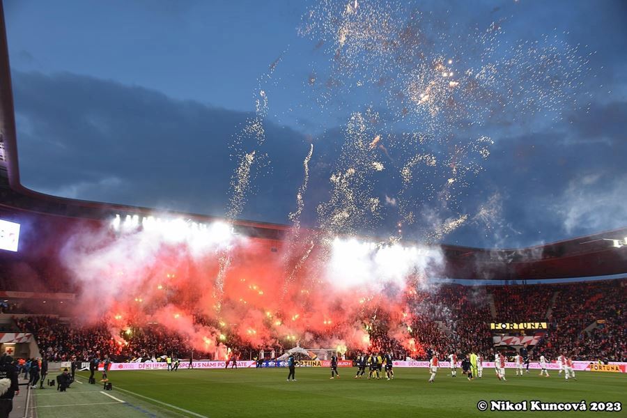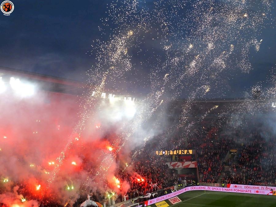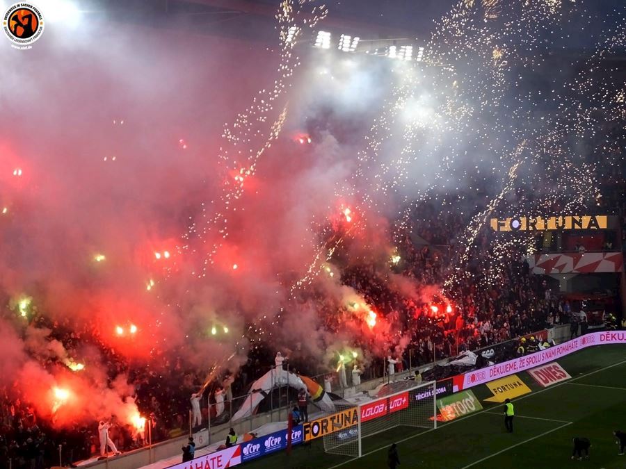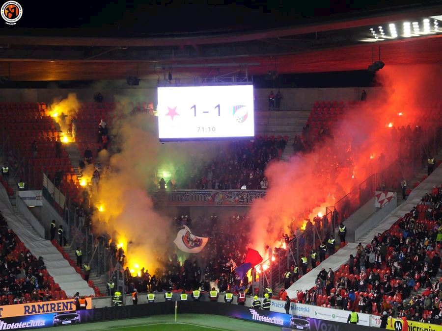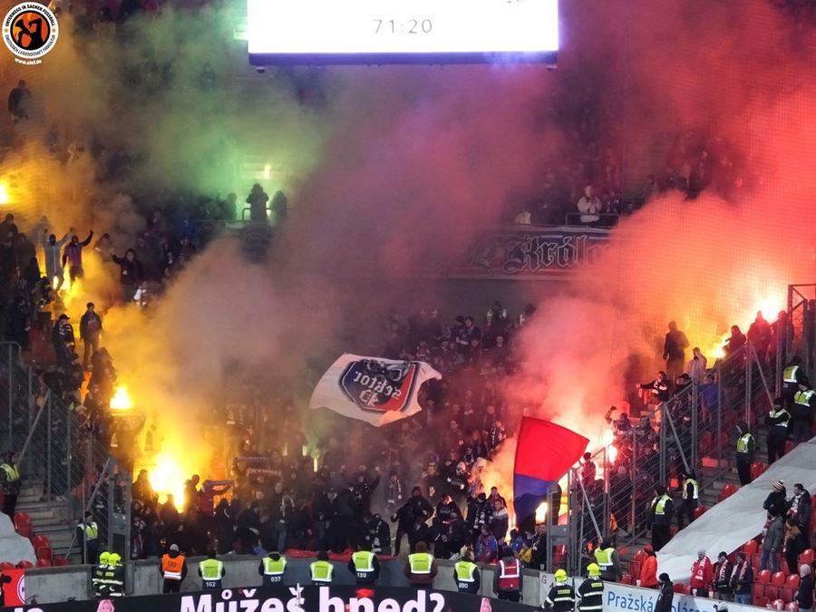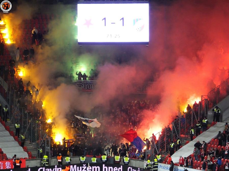 Chemická laboratoř Tribuny Sever to pořádně rozpálila! Vůně a záře pyra zaplavila i sektor hostí... Souboj prvních dvou týmu tabulky sledovalo v Edenu 18.678 diváků. Z výhdy 2:1 se nakonec radovali fanoušci Slavie.