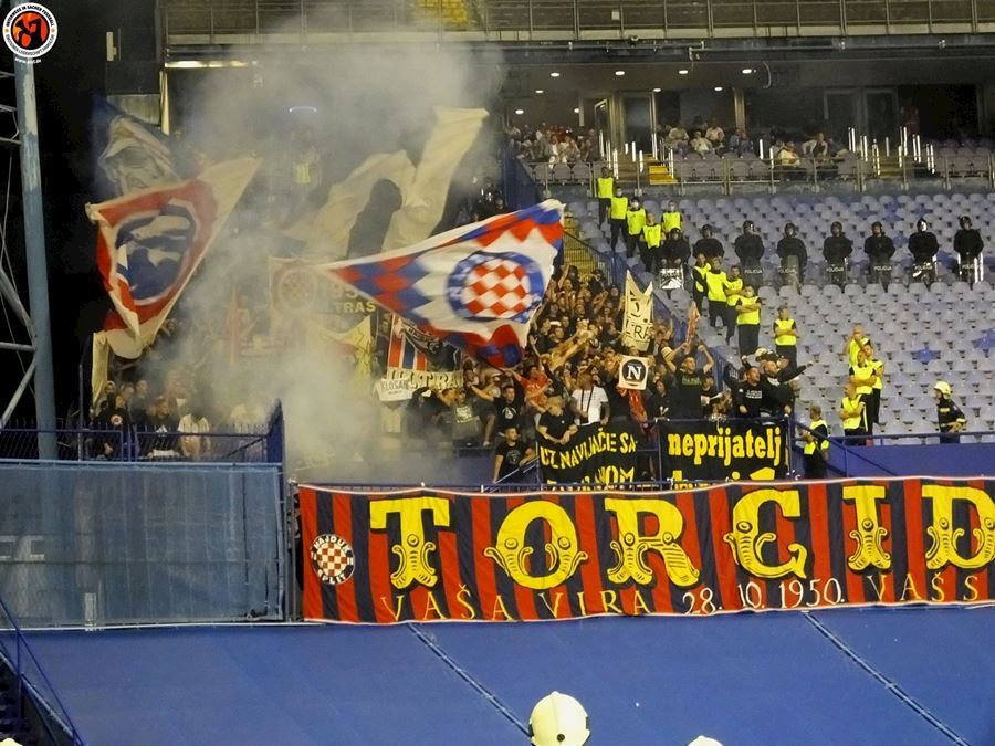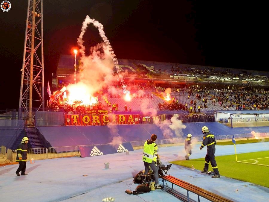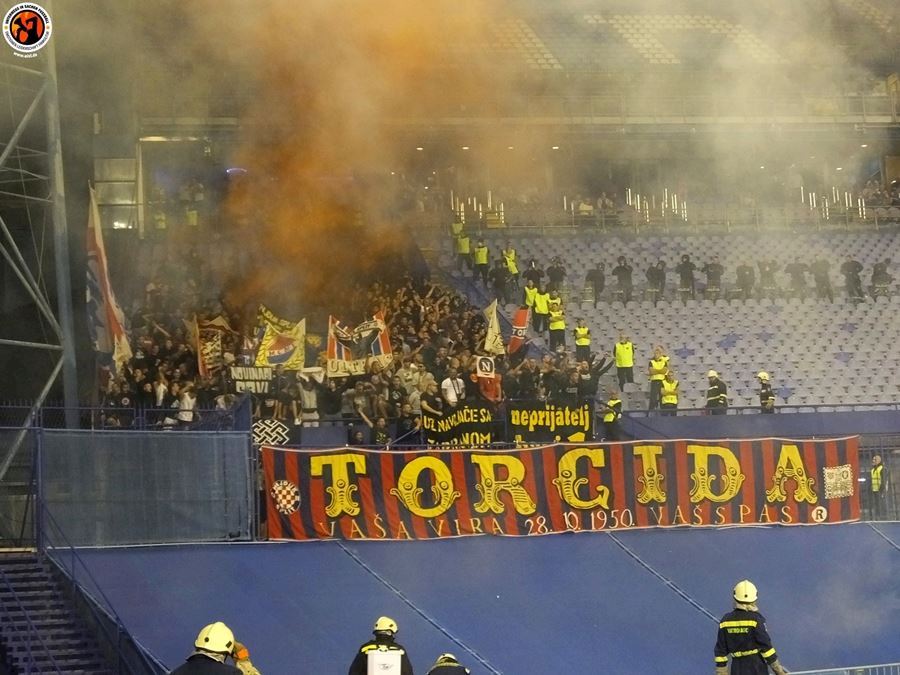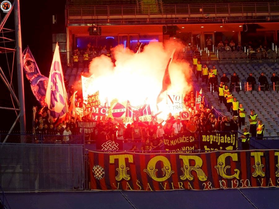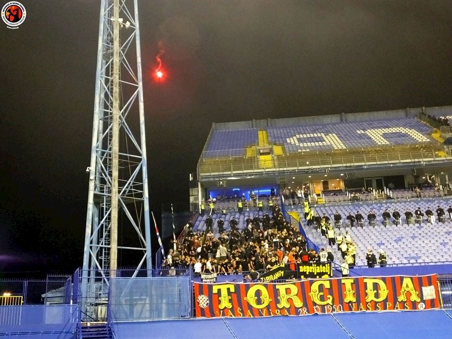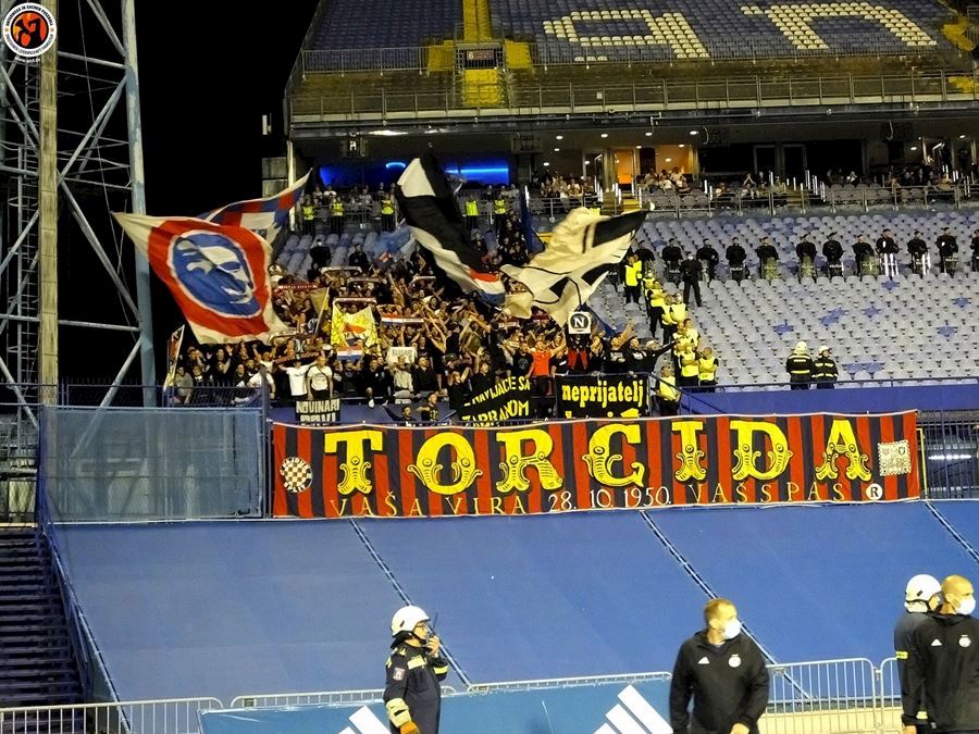 Největší chorvatské derby mezi Dinamem Zagreb a Hajdukem Split sledovalo na stadionu 6000 diváků (omezené množství kvůli koronaviru a narušení tribun po březnovém zemětřesení). Utkání provázely protesty domácích fanoušků kvůli kontroverzní rodině Mamičů, která ovládá záhřebský klub. Domácí BBB po deseti minutách na protest odcházejí a házejí pyro směrem k hrací ploše. Pyro se objevuje rovněž v hostujícím sektoru, kde Torcida slaví výhru 3:2.