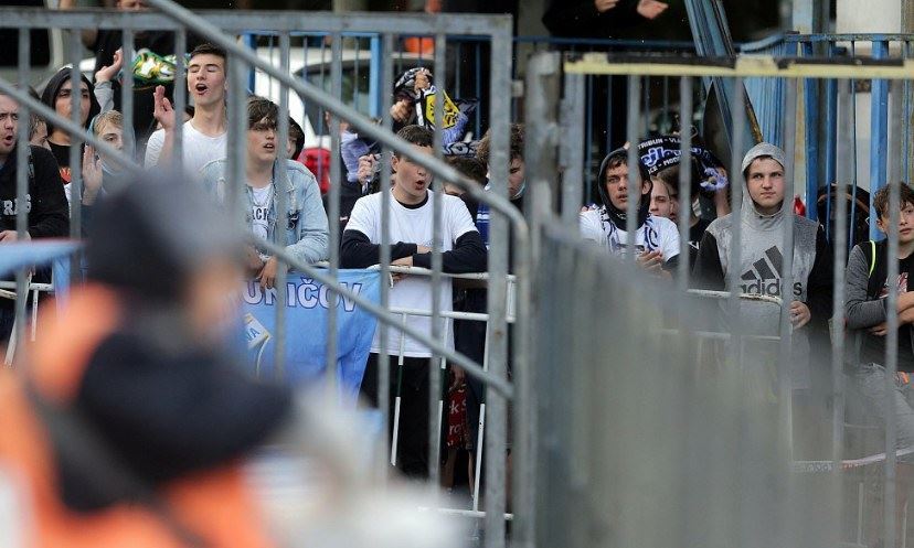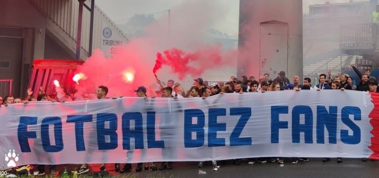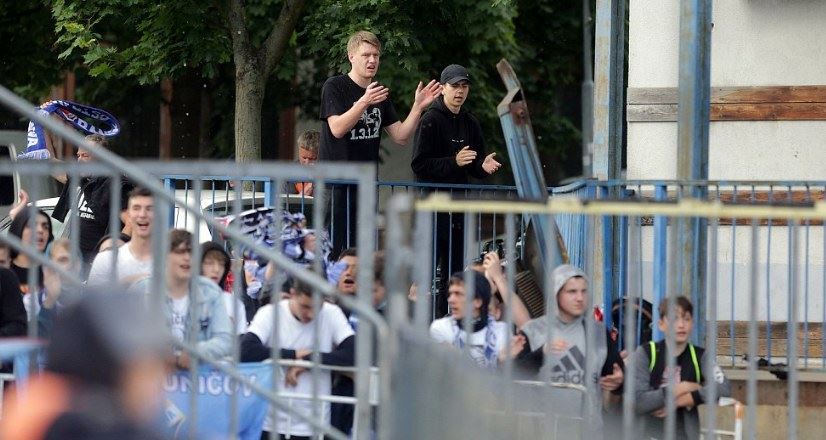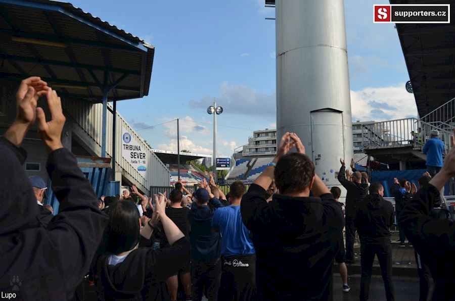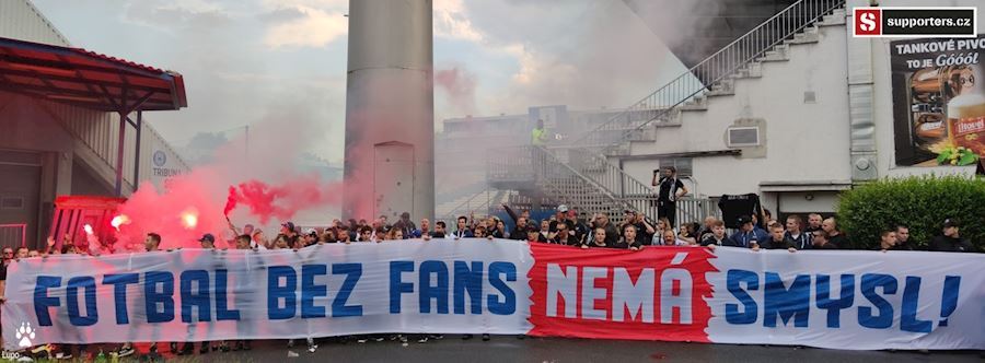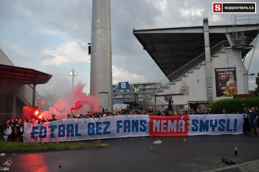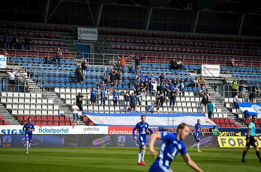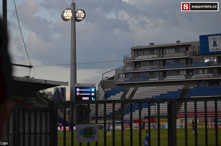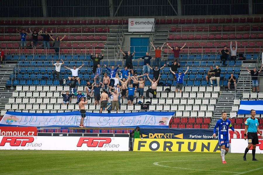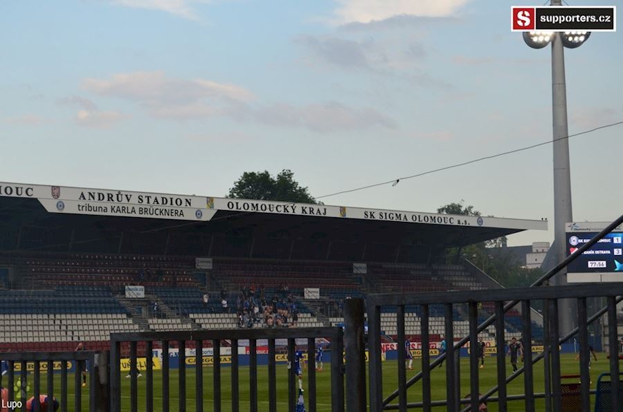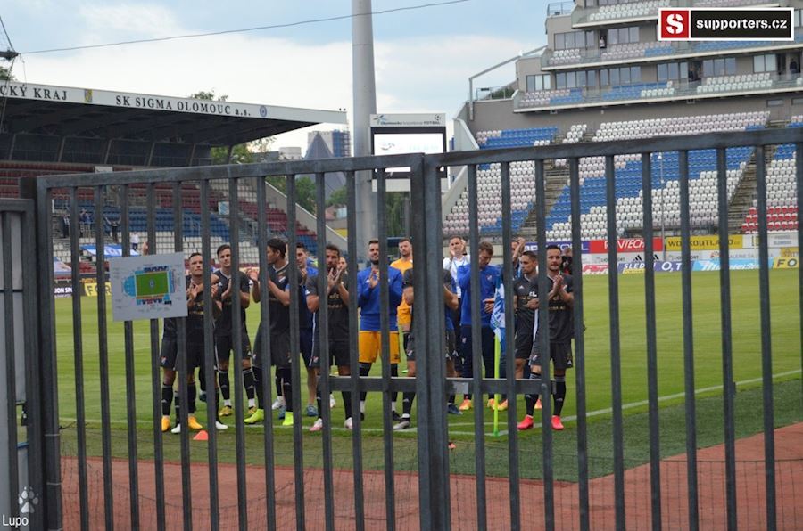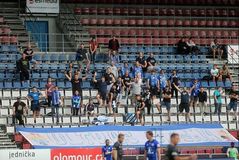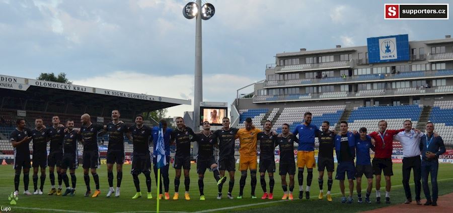 V Olomouci fandění za plotem, tradiční nápis a oslava s vůní pyrotechniky...