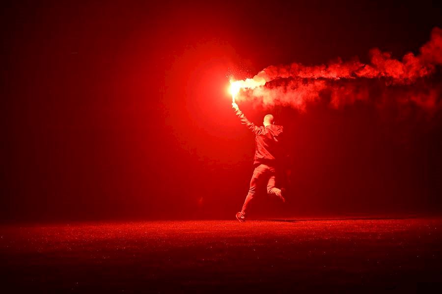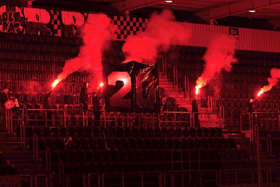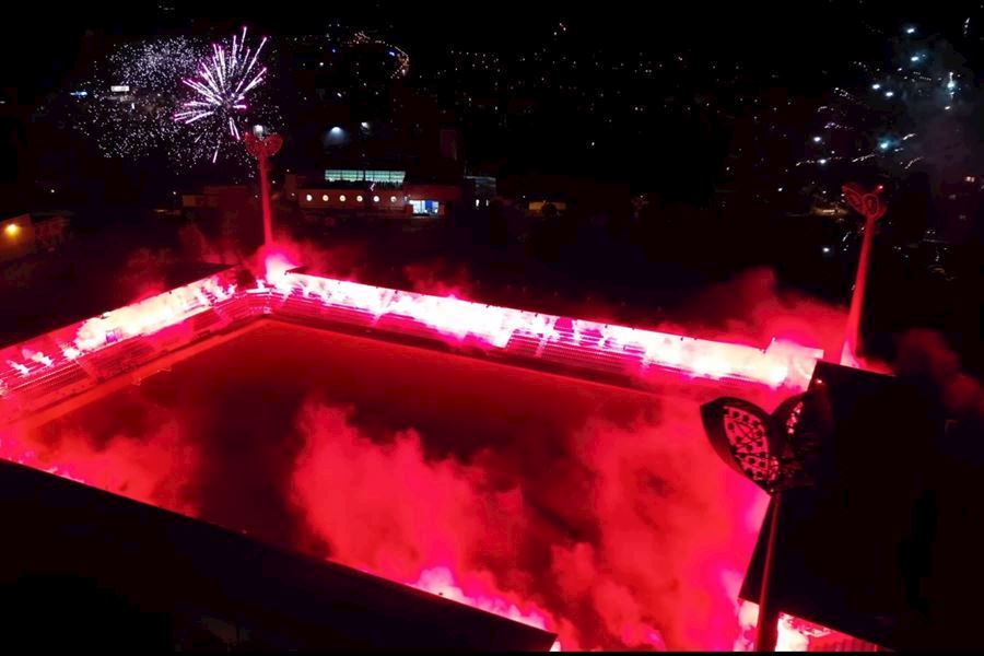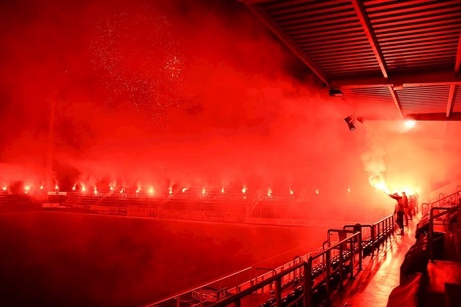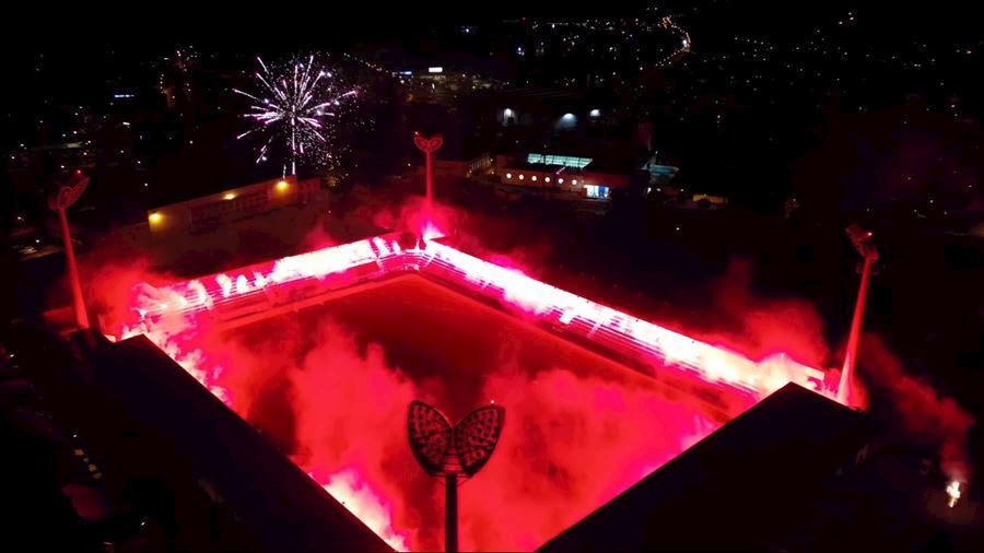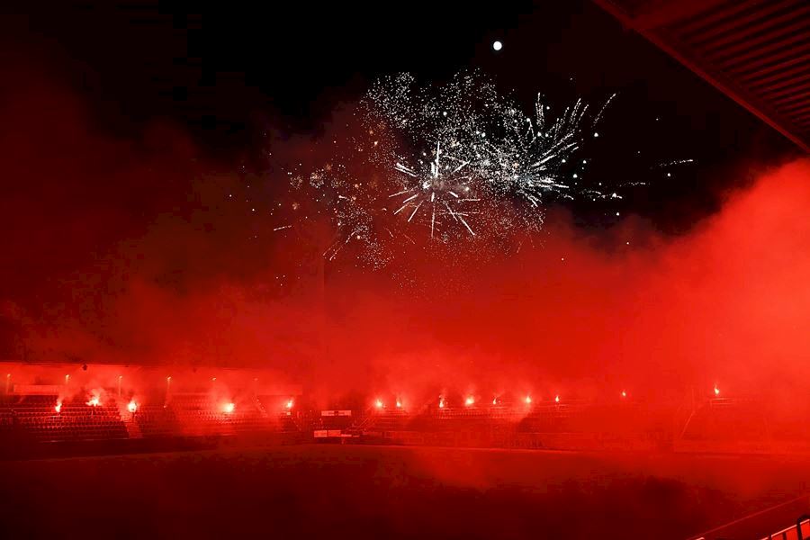 Fanoušci Slovácka oslavili 20 let stadionu v Uherském Hradišti večerní pyrošou... Fotbalový stadion Slovácka se otevřel v říjnu roku 2003.