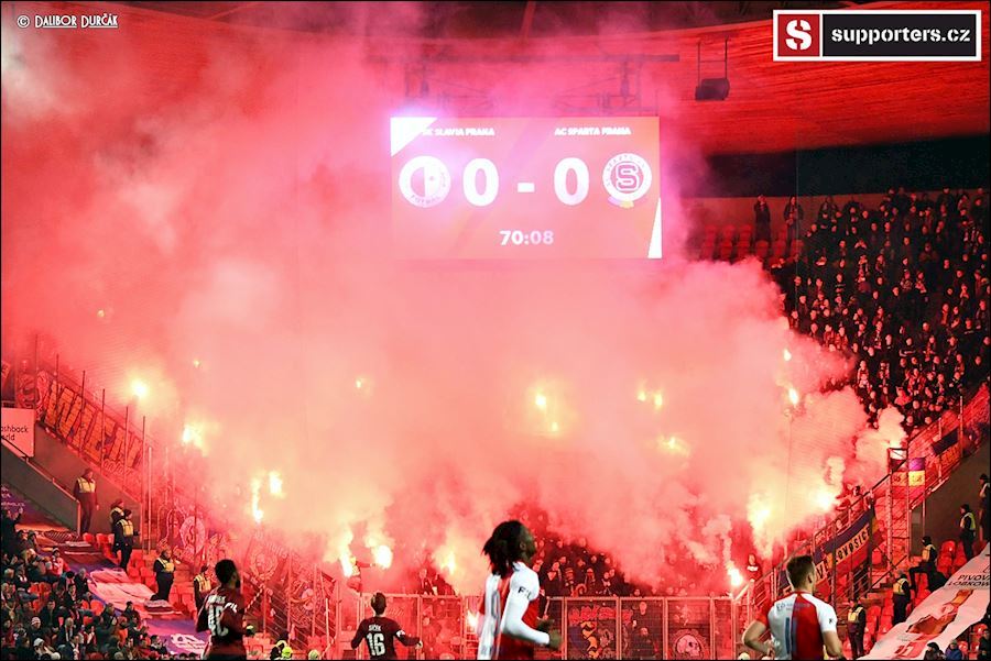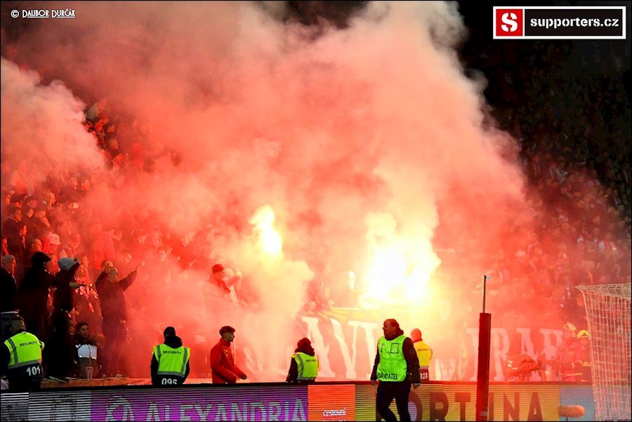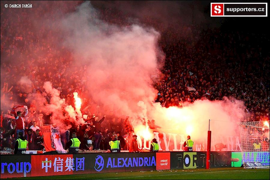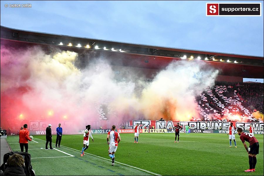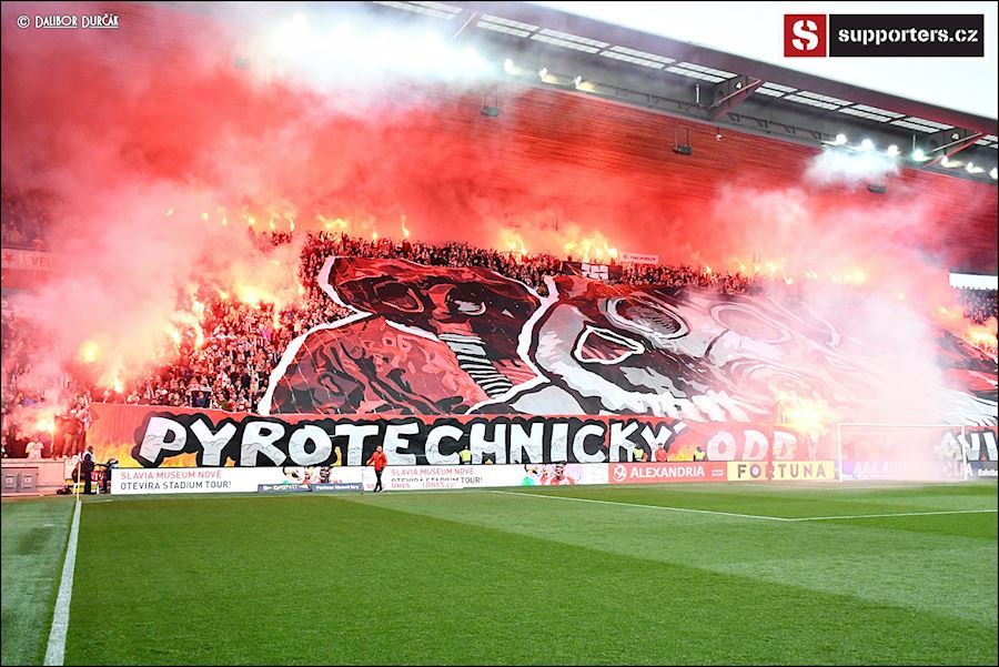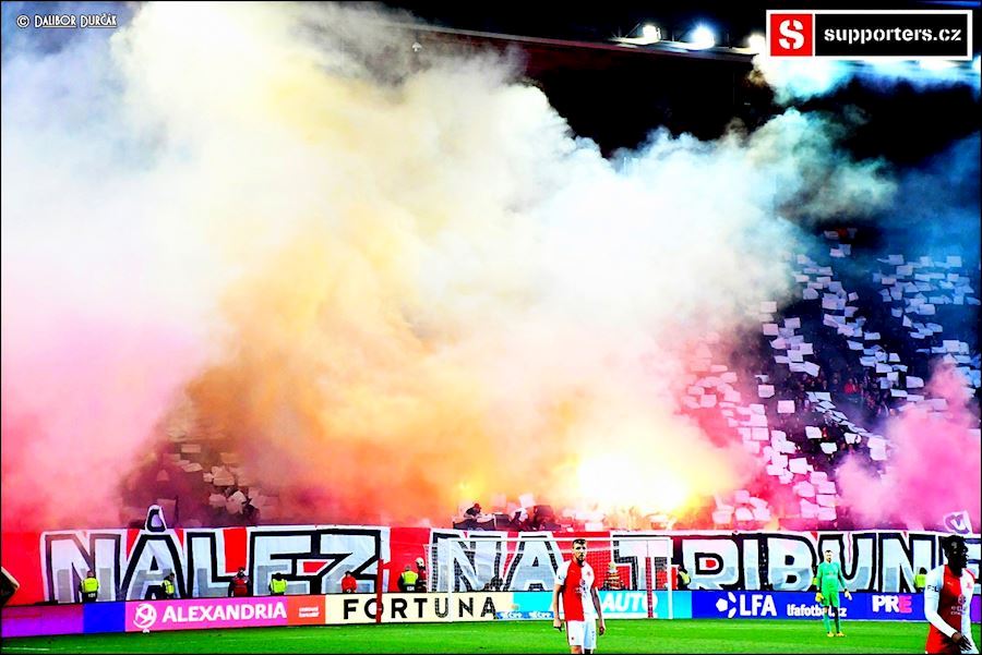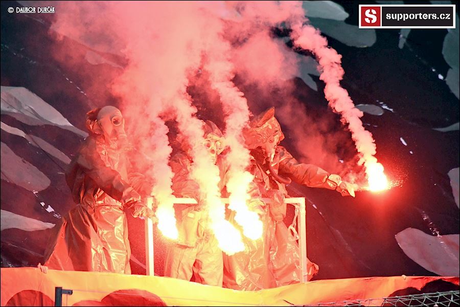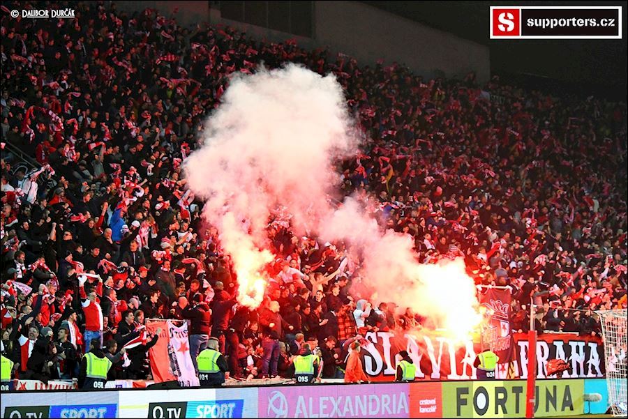 Hned na úvod utkání si nachystali svou prezentaci fanoušci Slavie z Tribuny Sever, kteří se přeměnili v PO Slavia Praha, tedy v Pyrotechnický oddíl Slavia Praha.