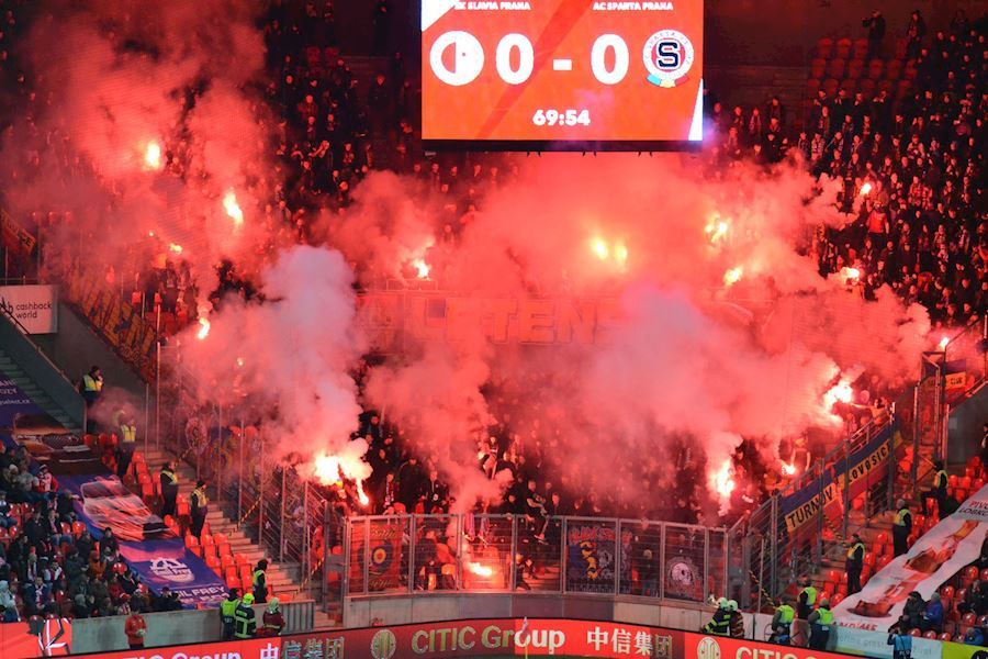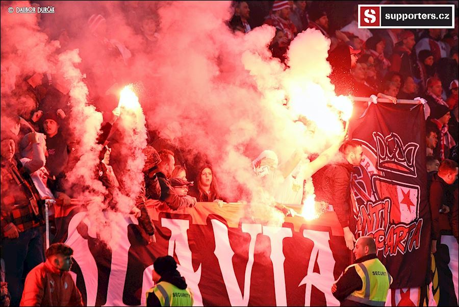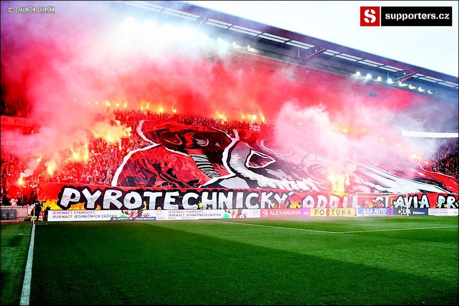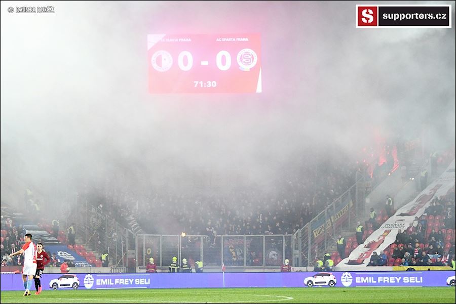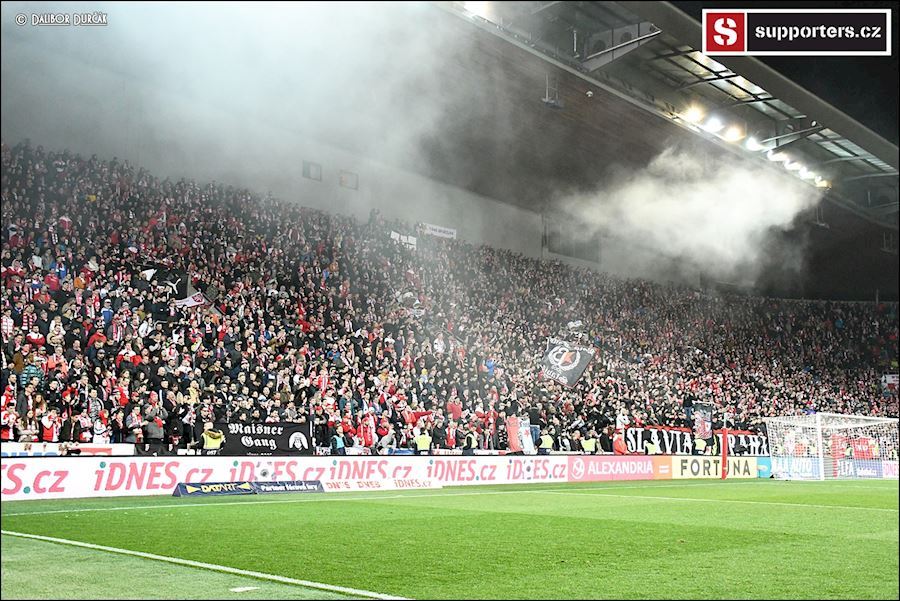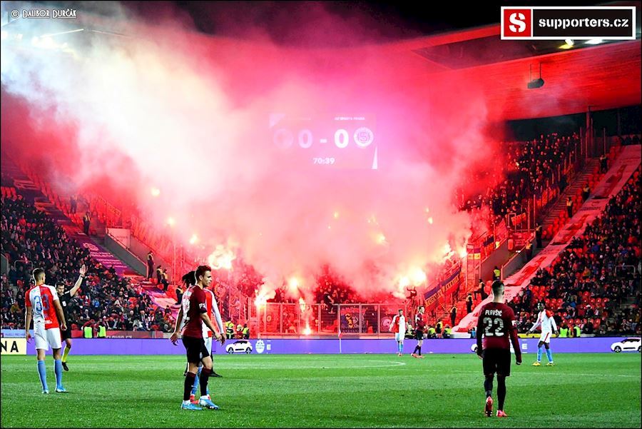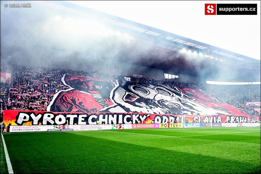 Hned na úvod utkání si nachystali svou prezentaci fanoušci Slavie z Tribuny Sever, kteří se přeměnili v PO Slavia Praha, tedy v Pyrotechnický oddíl Slavia Praha.