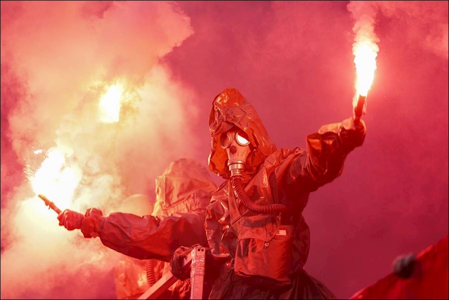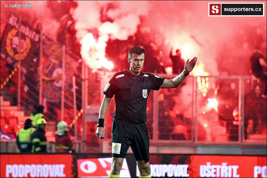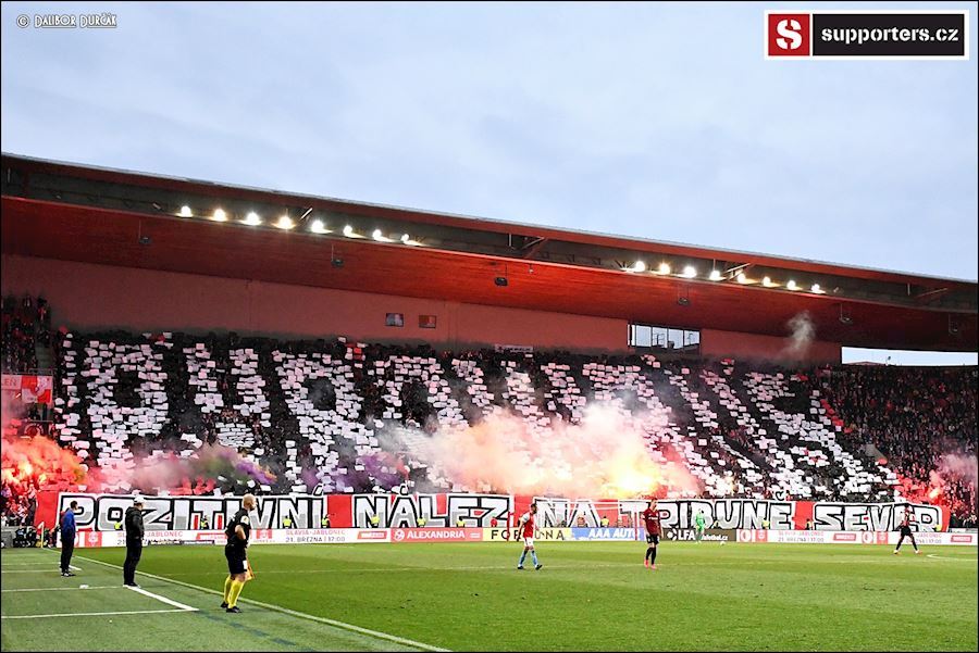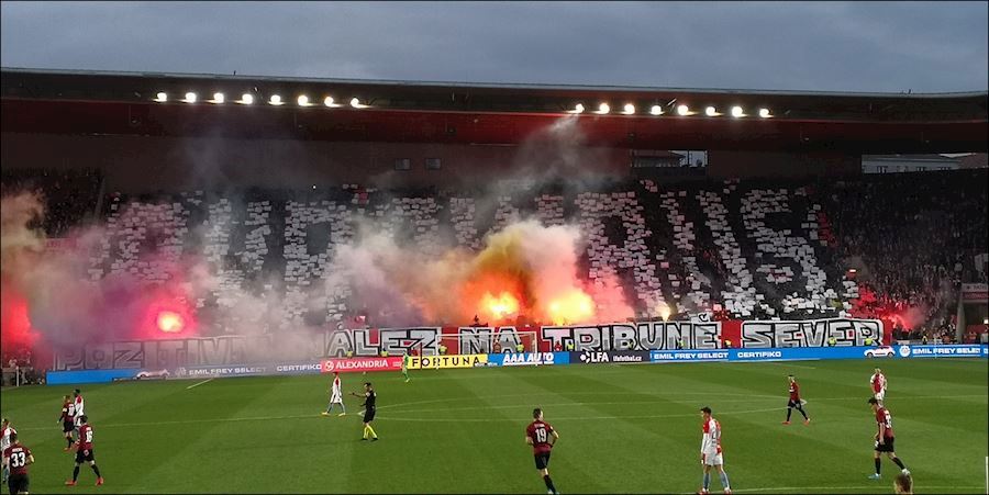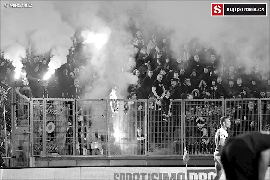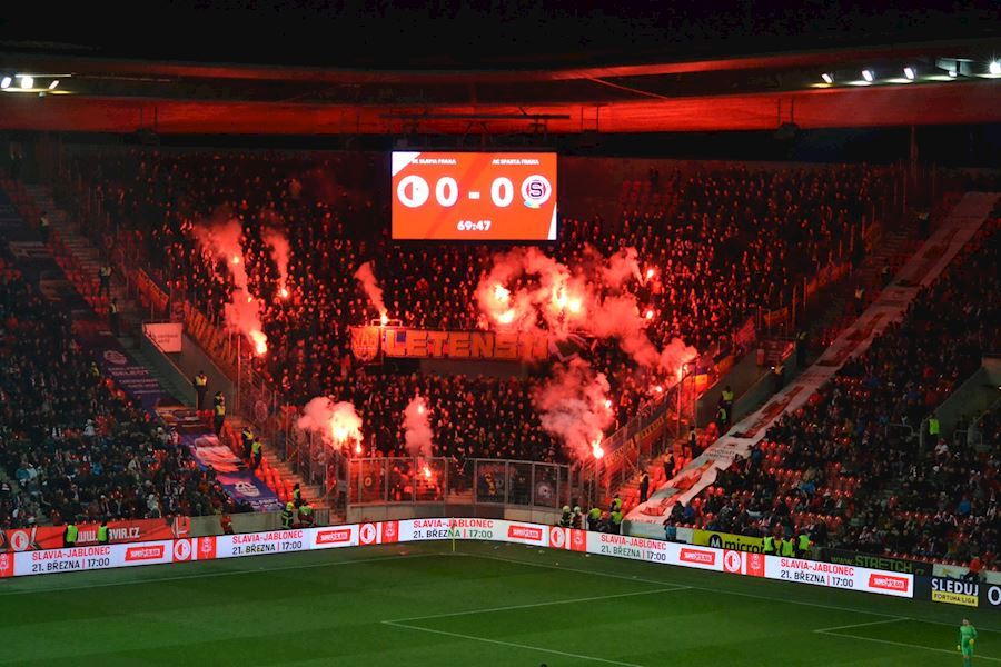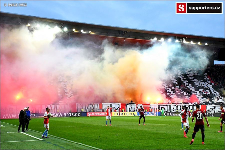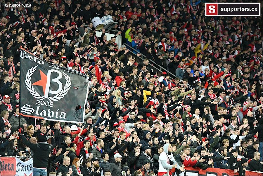 Hned na úvod utkání si nachystali svou prezentaci fanoušci Slavie z Tribuny Sever, kteří se přeměnili v PO Slavia Praha, tedy v Pyrotechnický oddíl Slavia Praha.