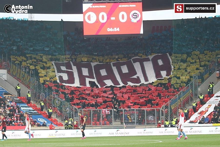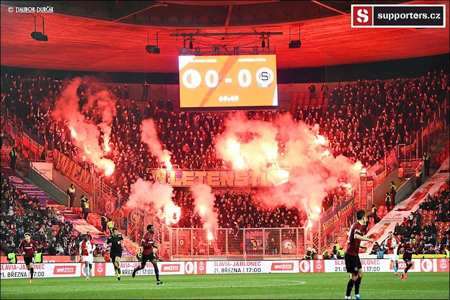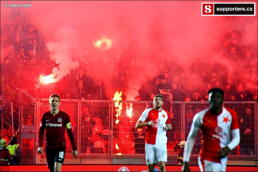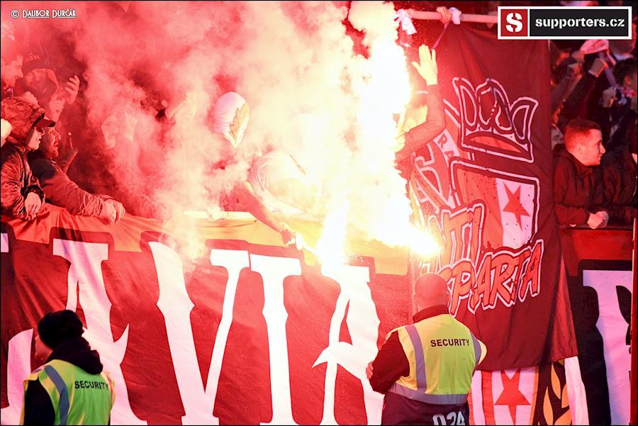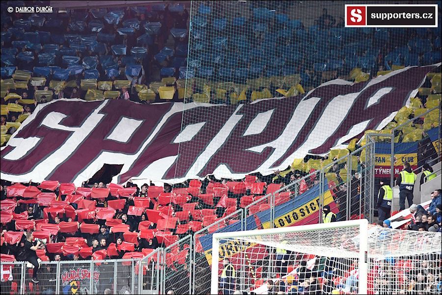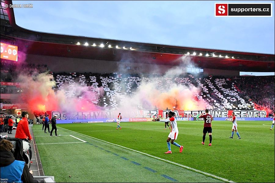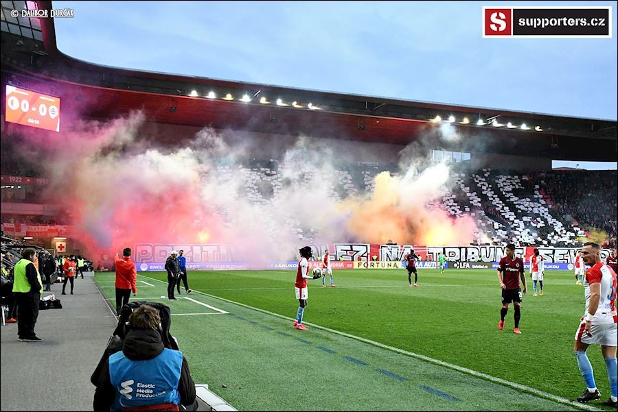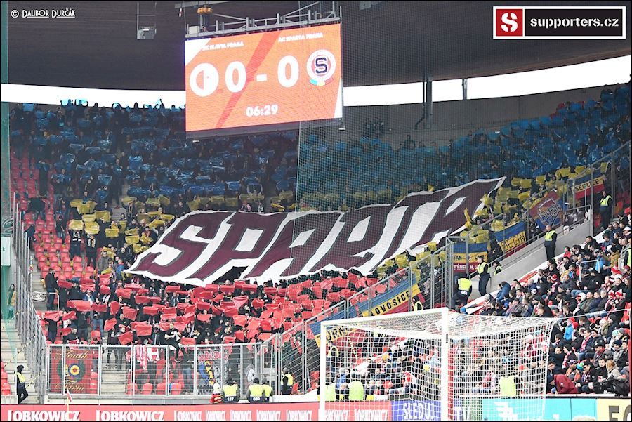 Tím ale ultras aktivity rozhodně neskončily. Prezentovali se také fanoušci v sektoru hostí a ještě do přestávky stihli svou druhou choreografii předvést také Slavisté.