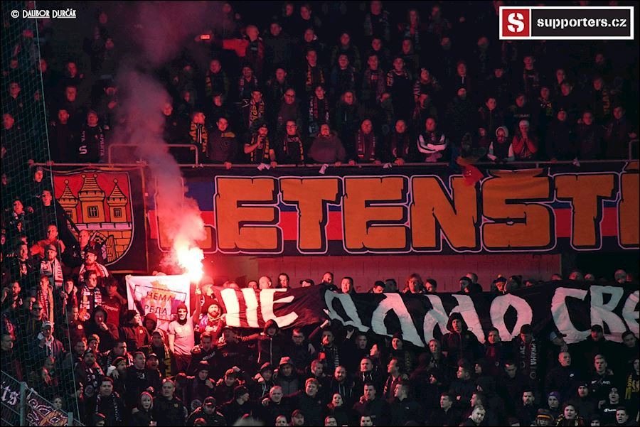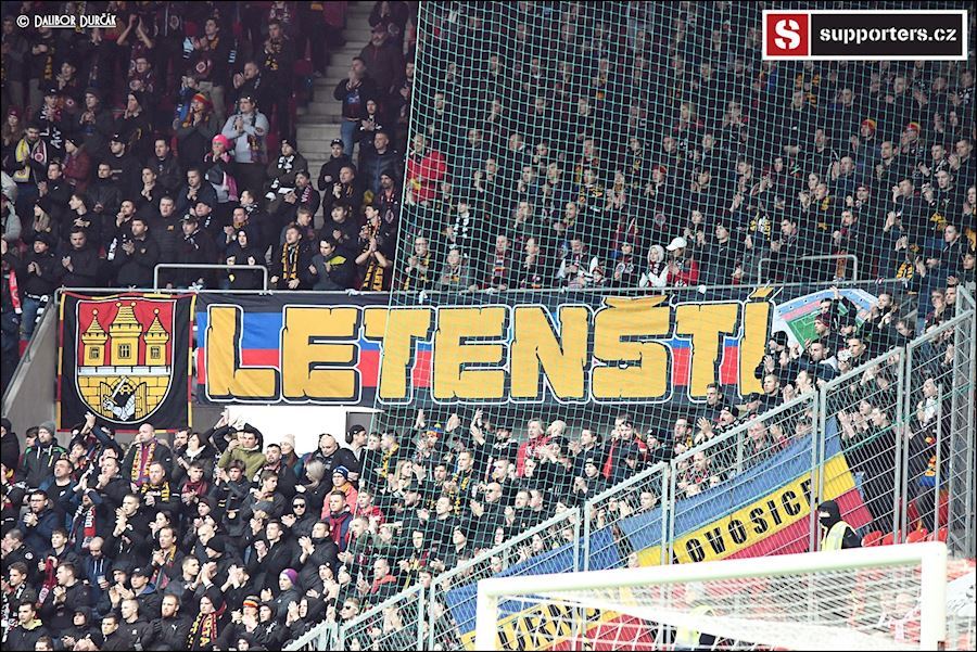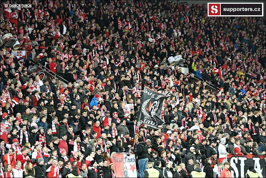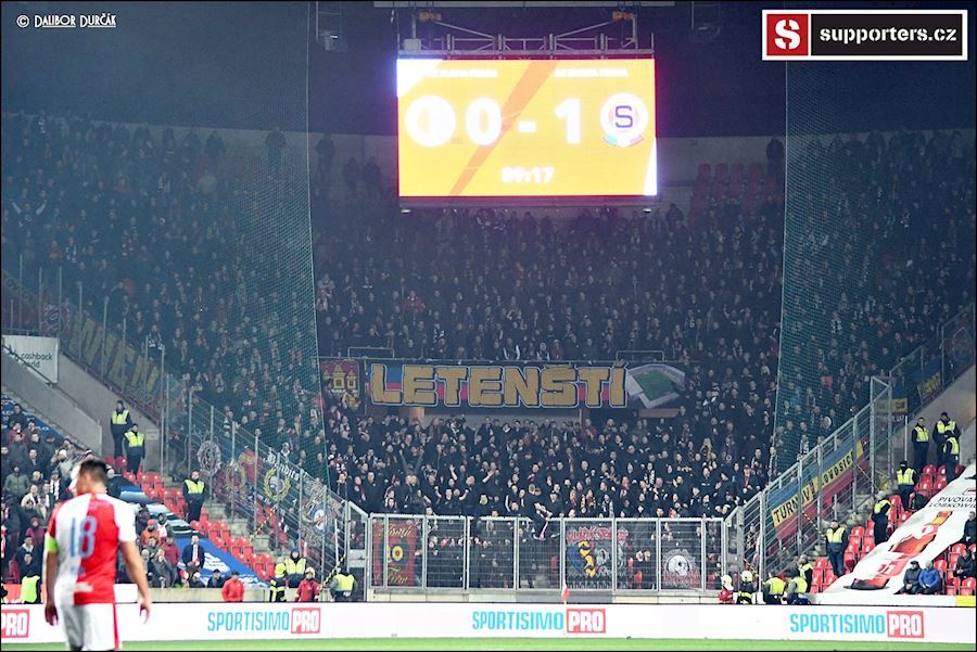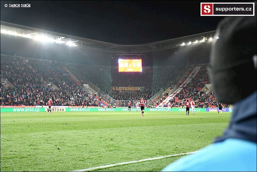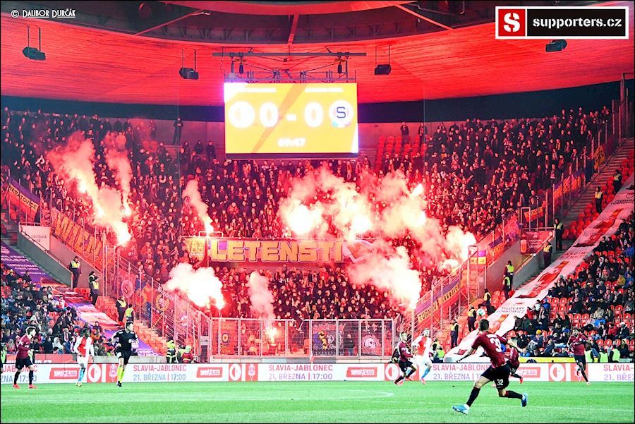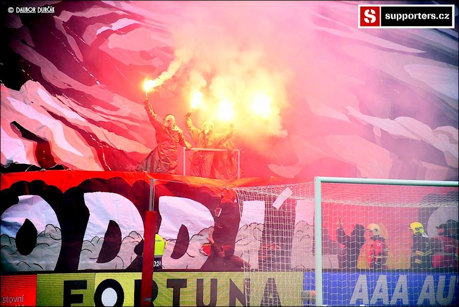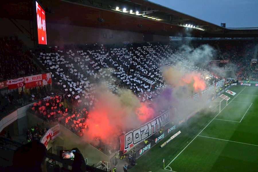 Tím ale ultras aktivity rozhodně neskončily. Prezentovali se také fanoušci v sektoru hostí a ještě do přestávky stihli svou druhou choreografii předvést také Slavisté.