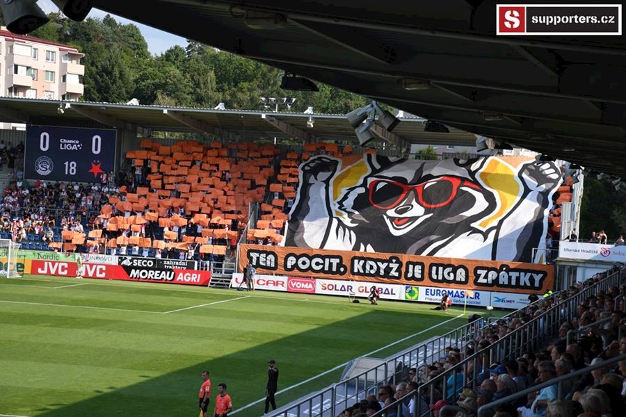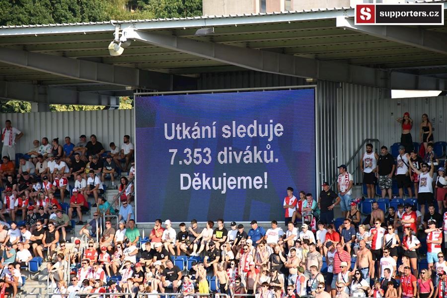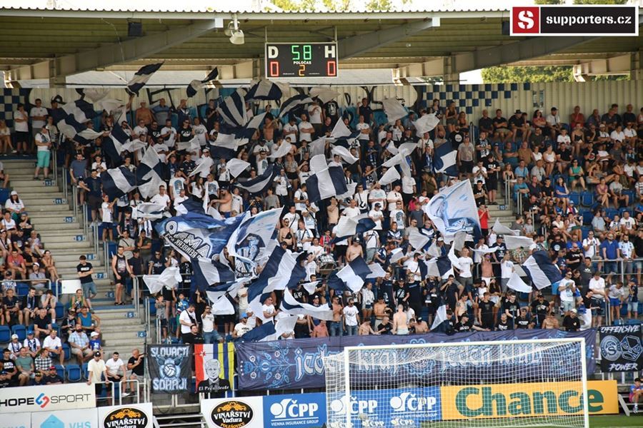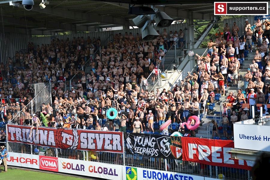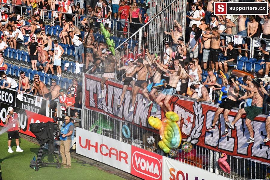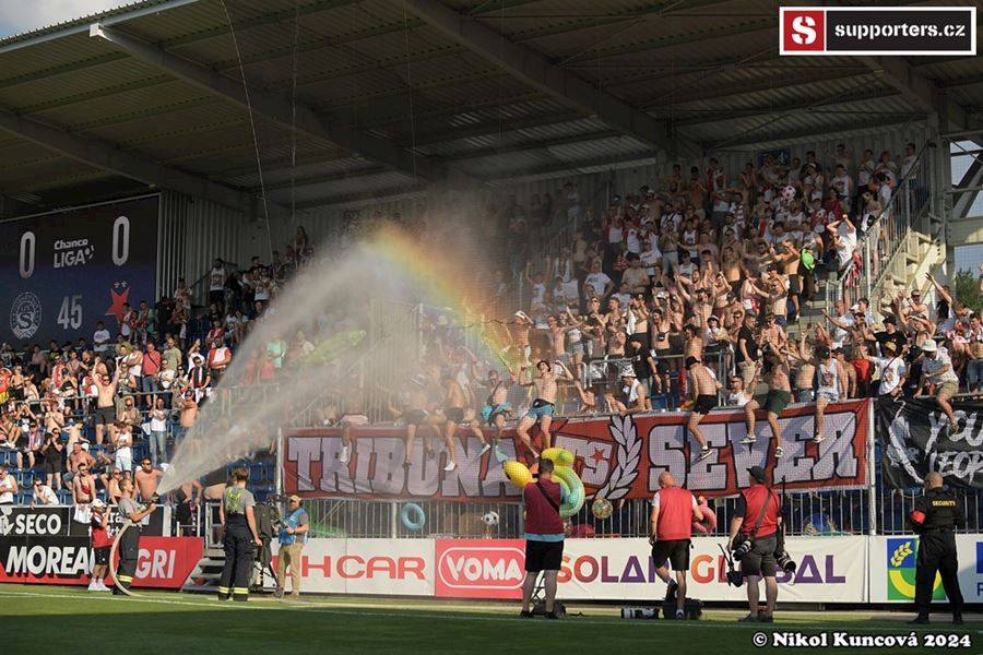 I bez branek může být zábava. Oba tábory se hlasitě baví a Slávisté navíc vyrazili na Slovácko v plážovém stylu. Díky součinnosti s místními hasiči dokonce měli v sektoru naplněný bazének. Utkání konči bez branek, ale 7.353 diváků se určitě nenudilo.