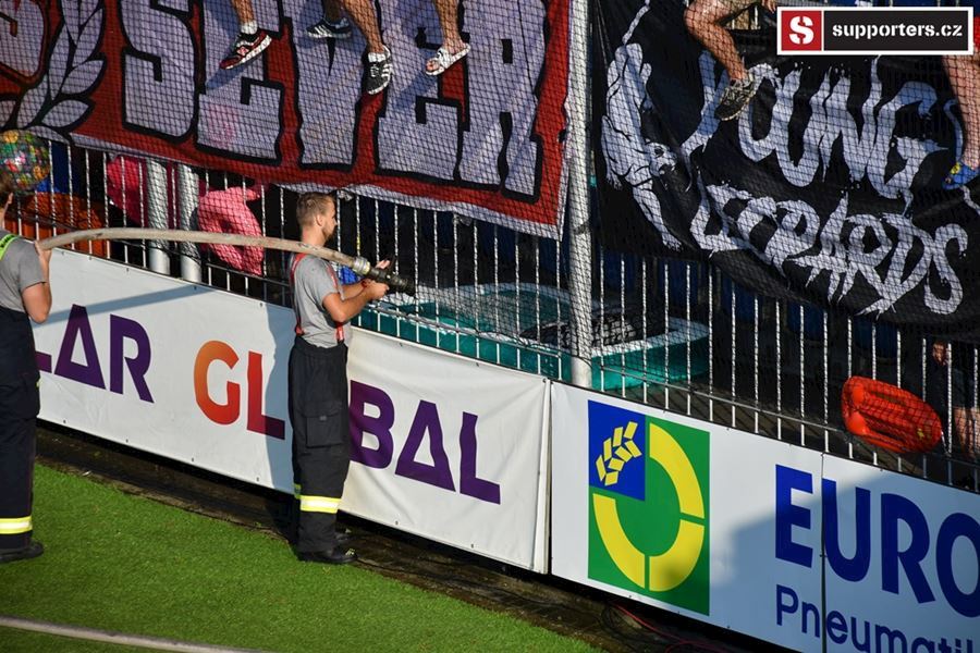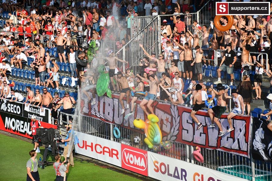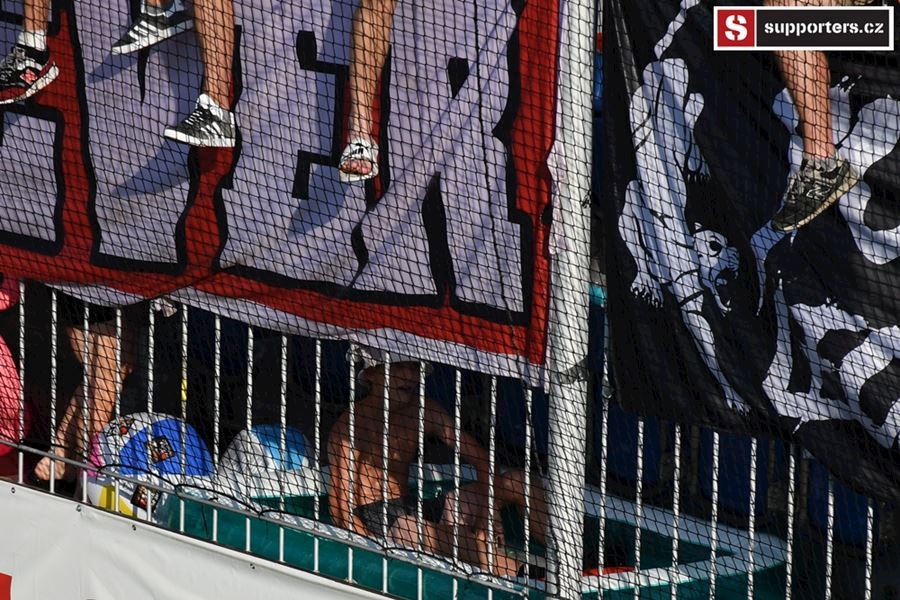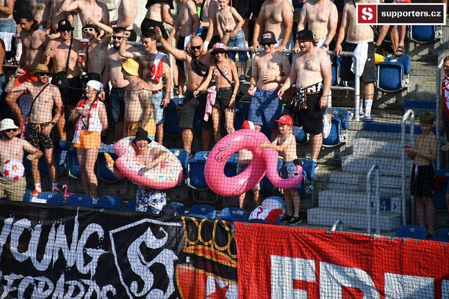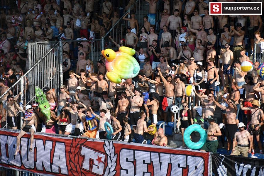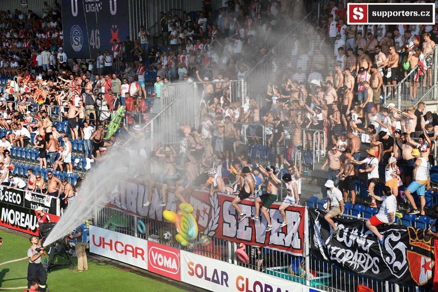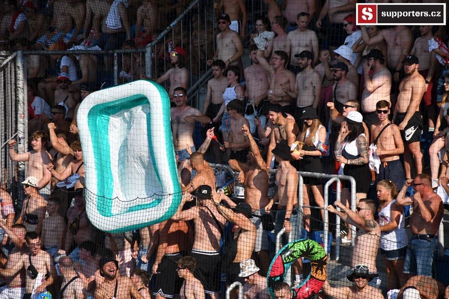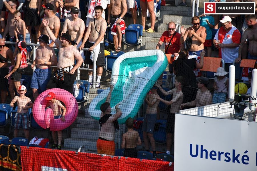 I bez branek může být zábava. Oba tábory se baví a Slávisté navíc vyrazili na Slovácko v plážovém stylu. Díky místním hasičům dokonce měli v sektoru naplněný bazének...