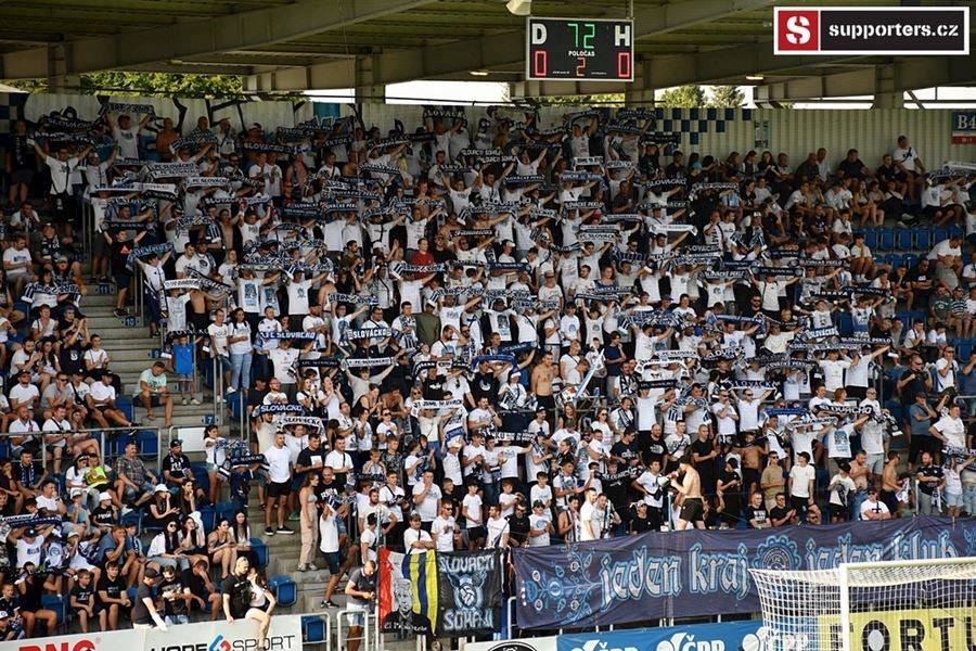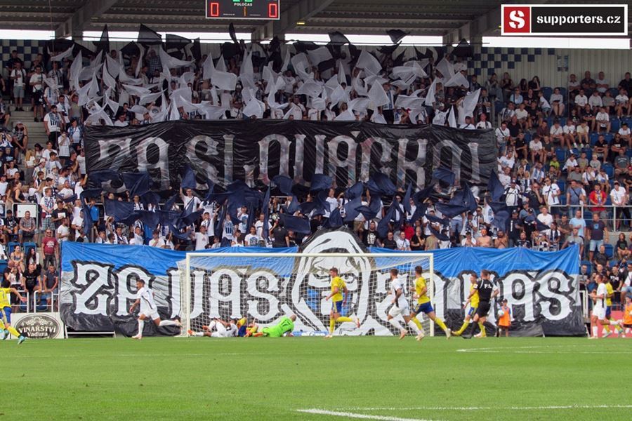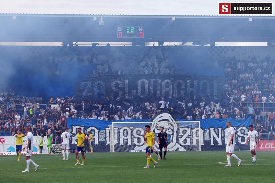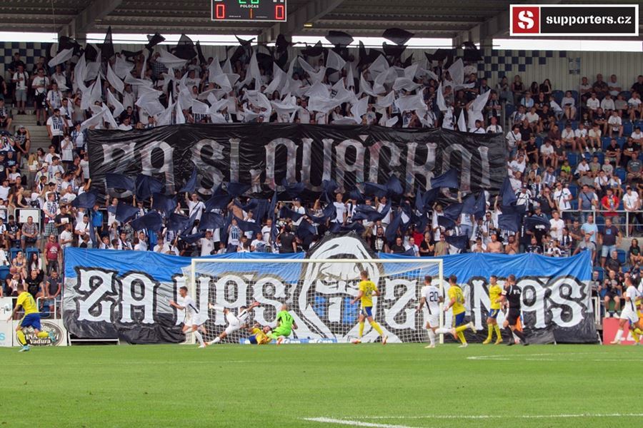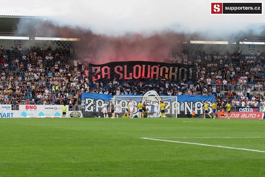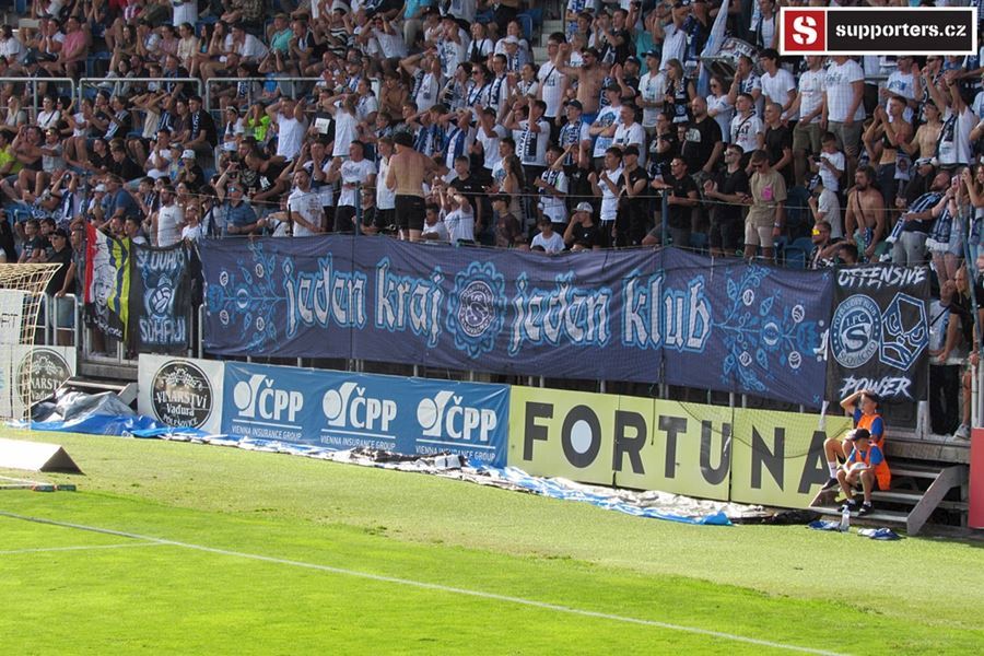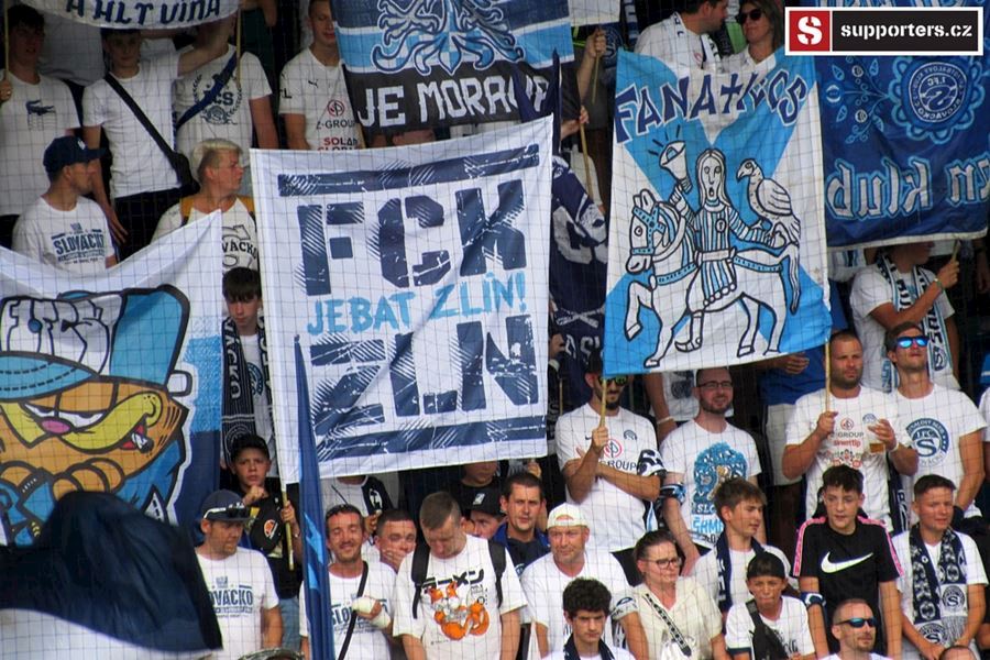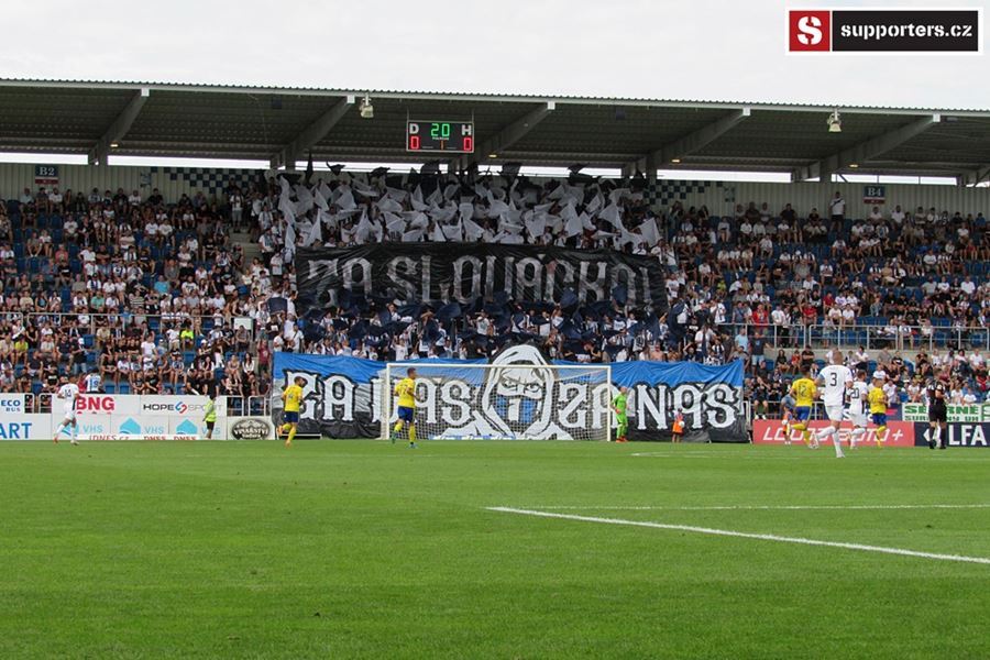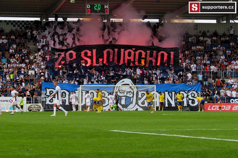 Krajské derby mezi Slováckem a Zlínem nabídlo hlasitou podporu obou táborů. V domácím sektoru nechybělo choreo a pyro. Hosté se tentokrát prezentovat nemohli. O to víc však byli slyšet.