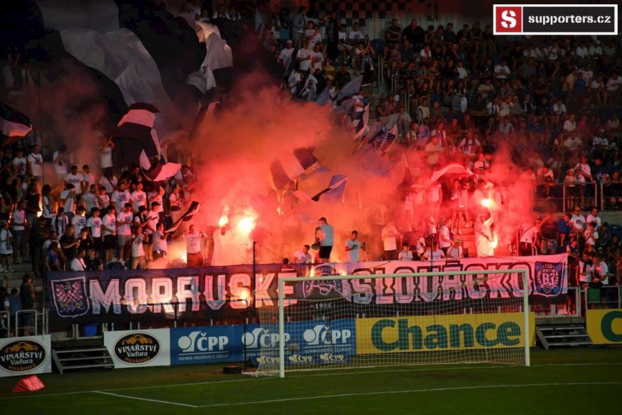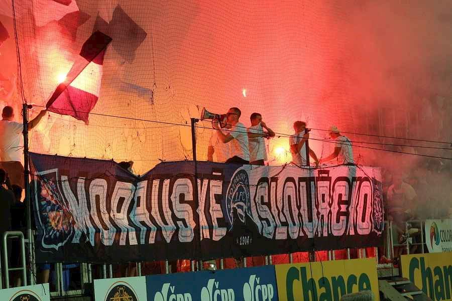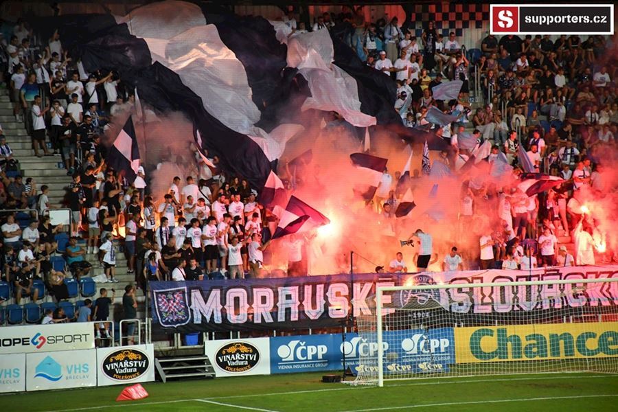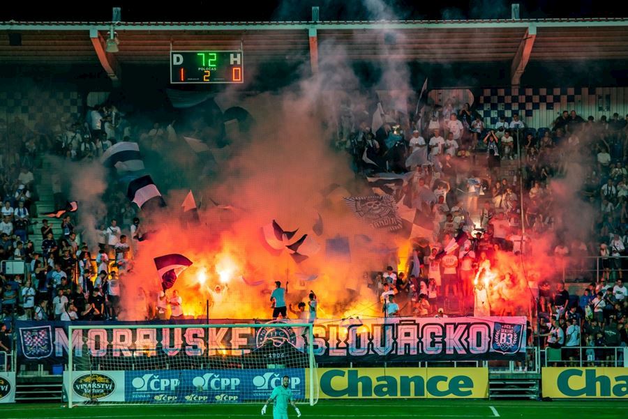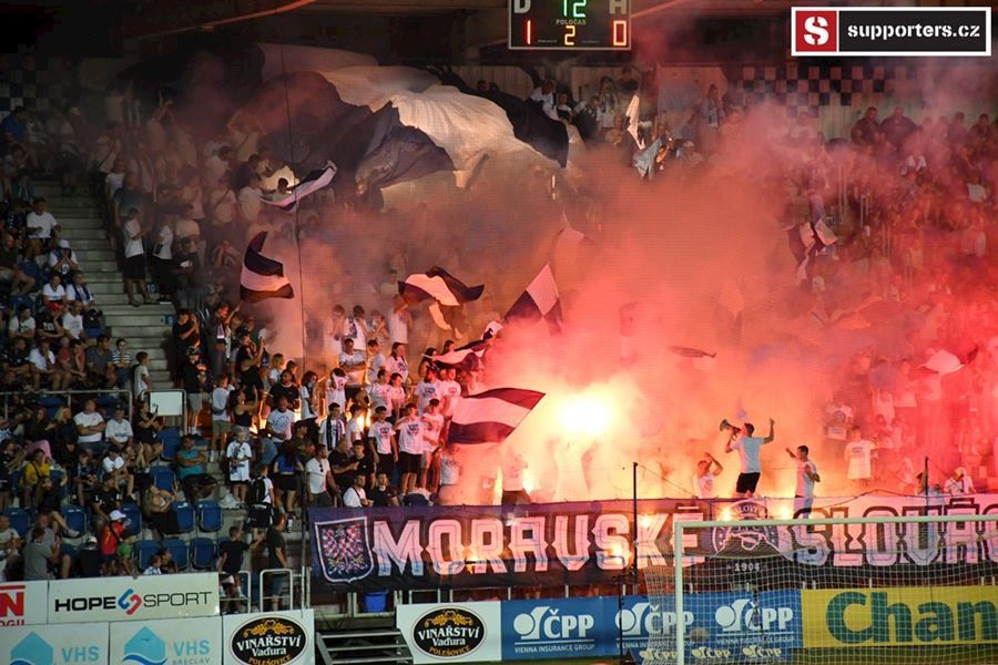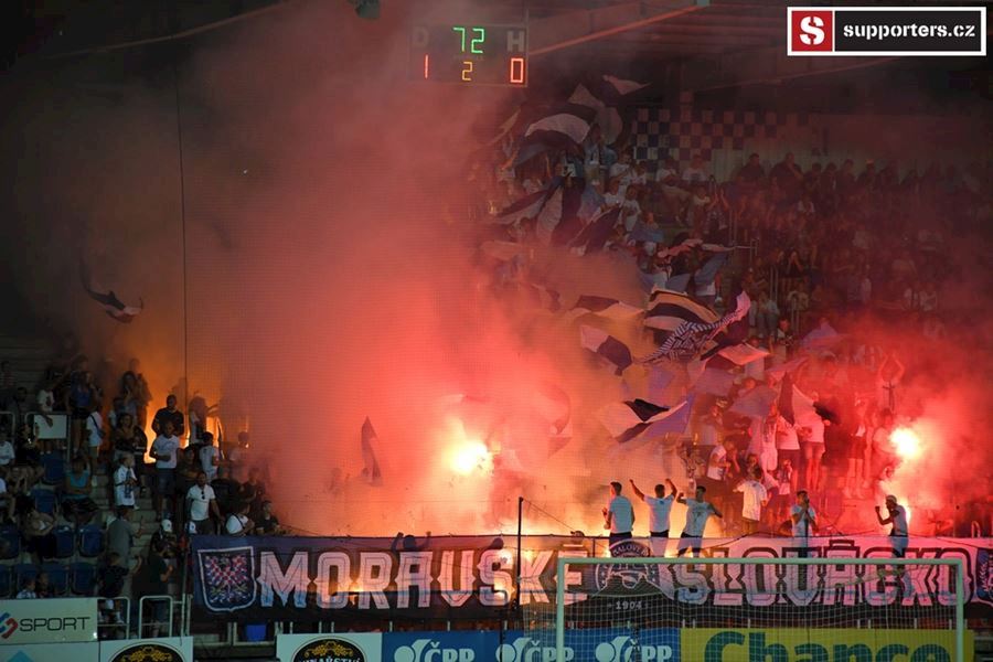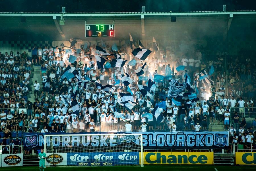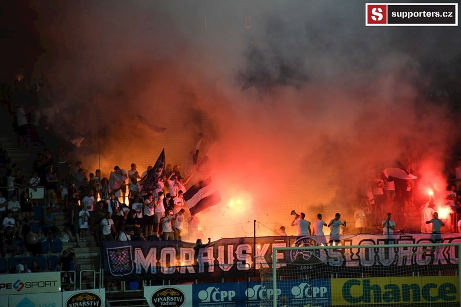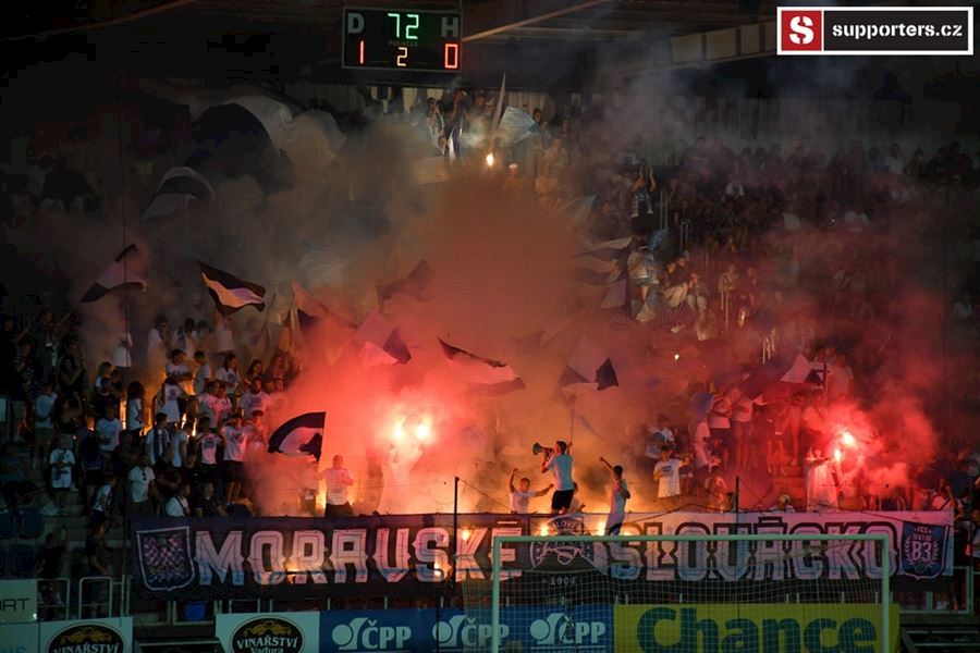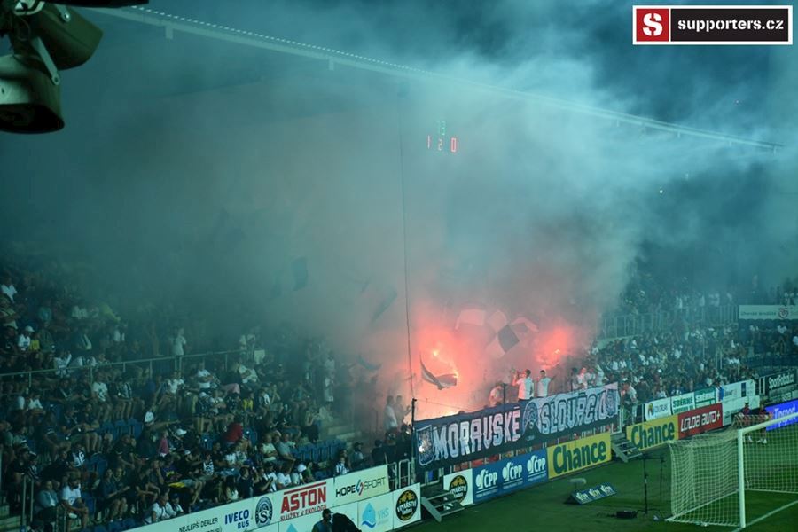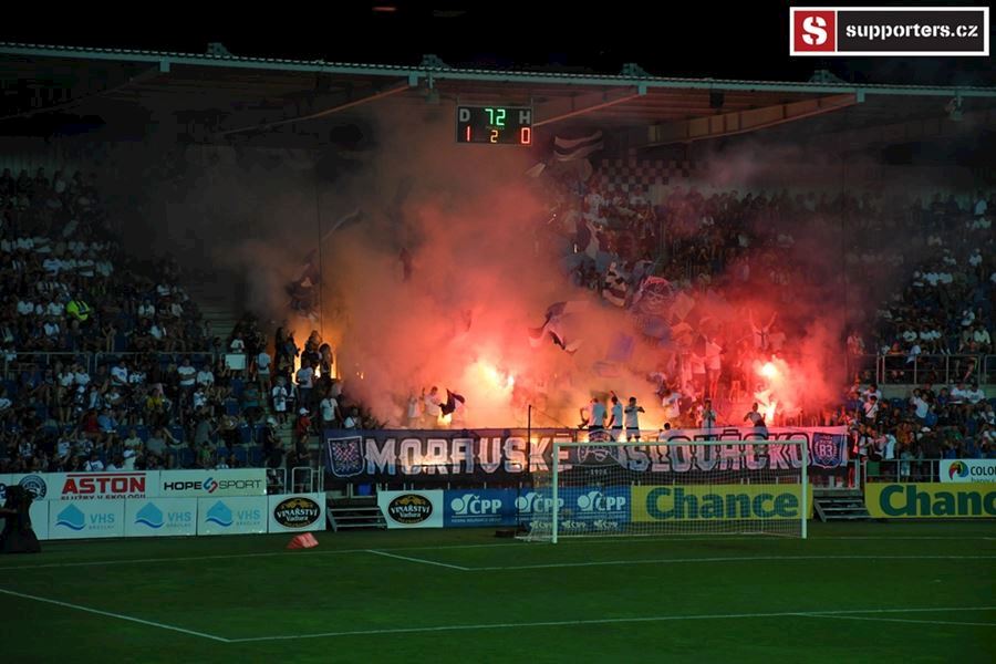 Na Slovácku se o skvělou atmosféru staraly oba tábory. Chachaři opět okupovali jižní tribunu, kde jich bylo na osm stovek. Stadion prosvítilo pyro obou táborů...