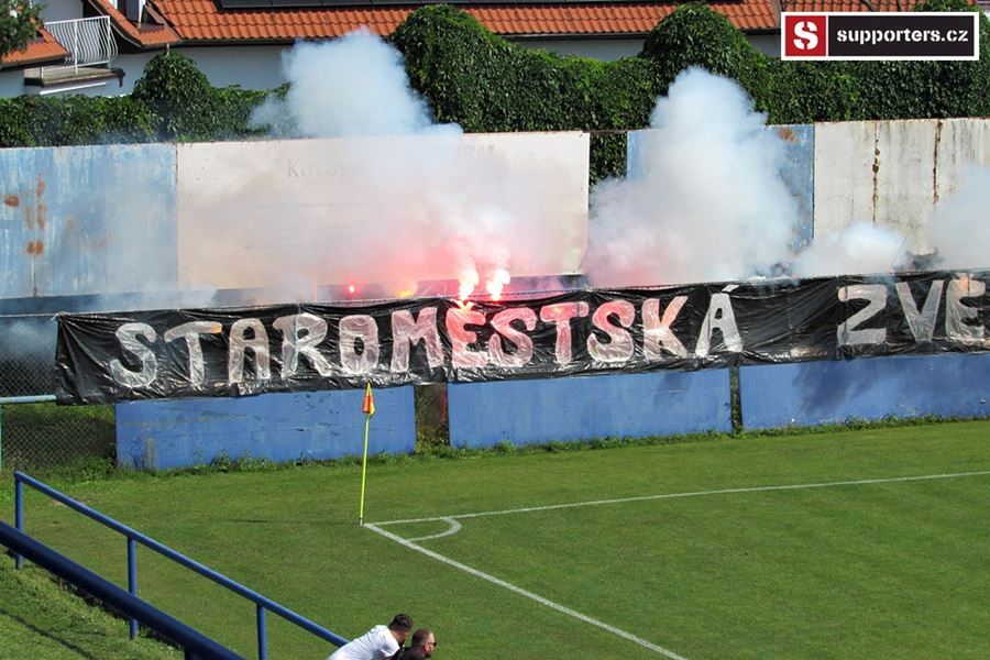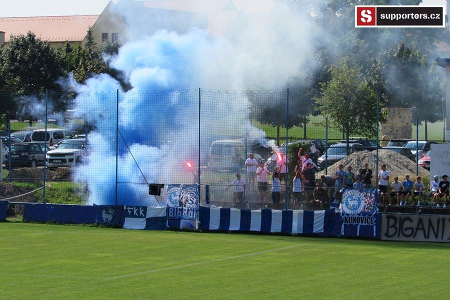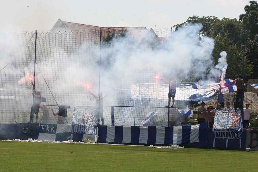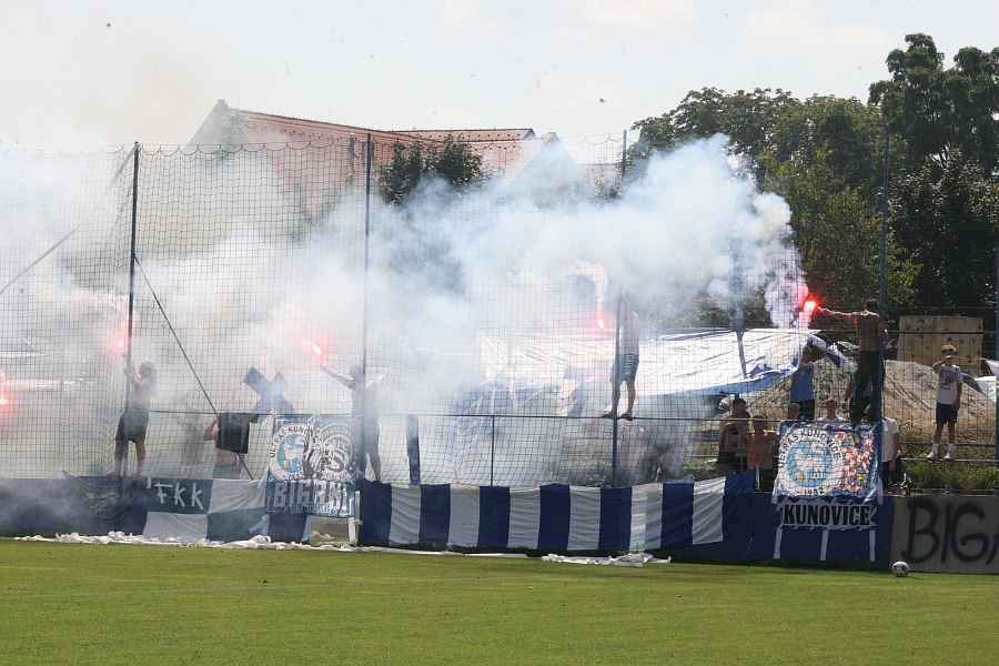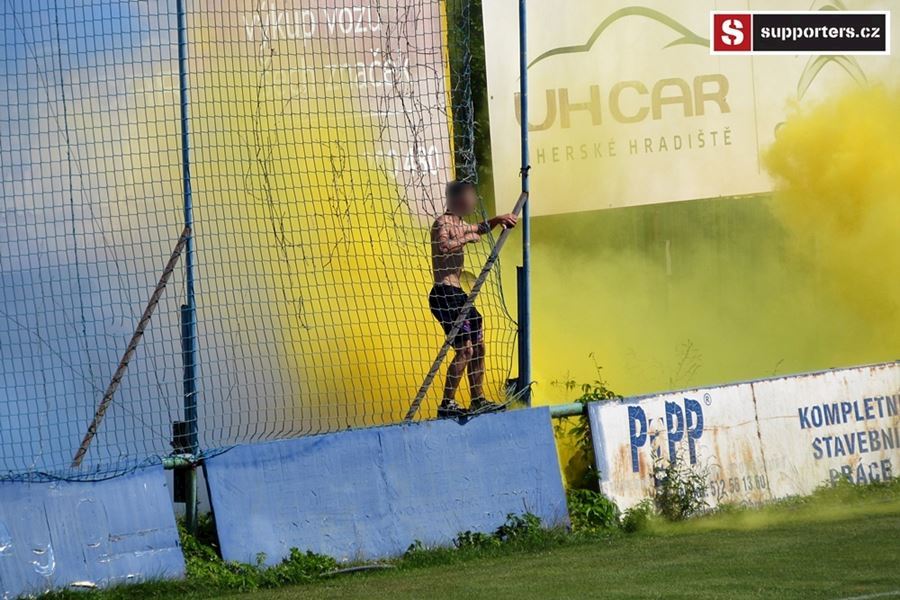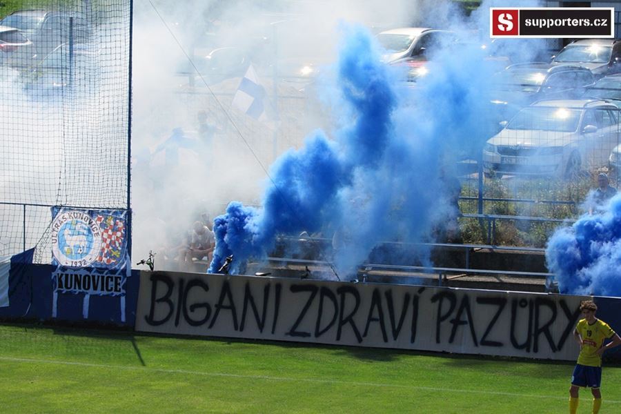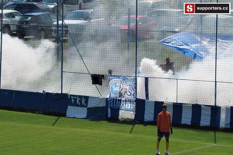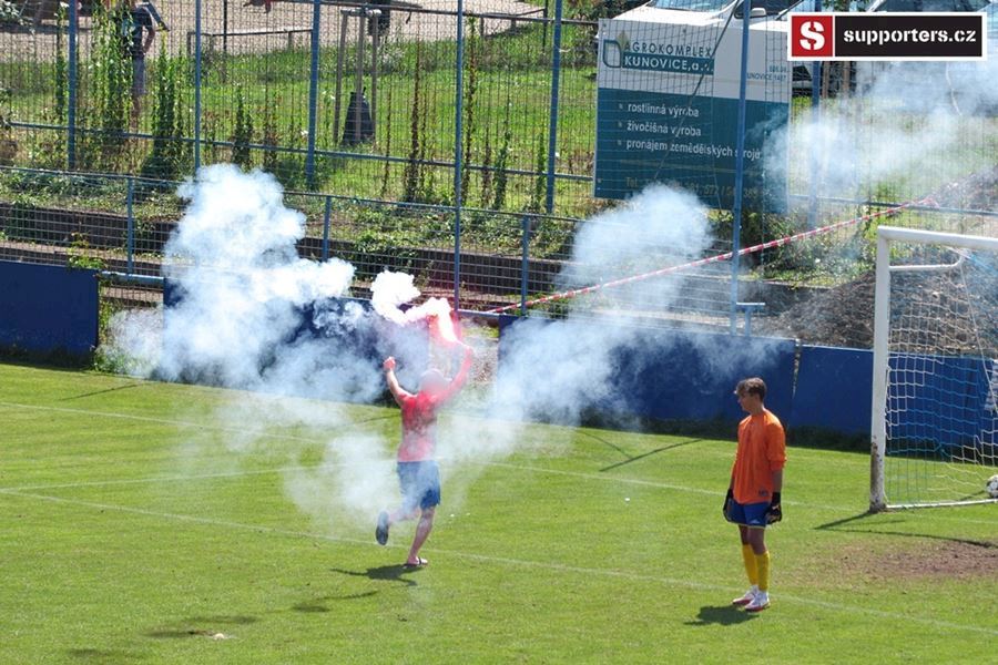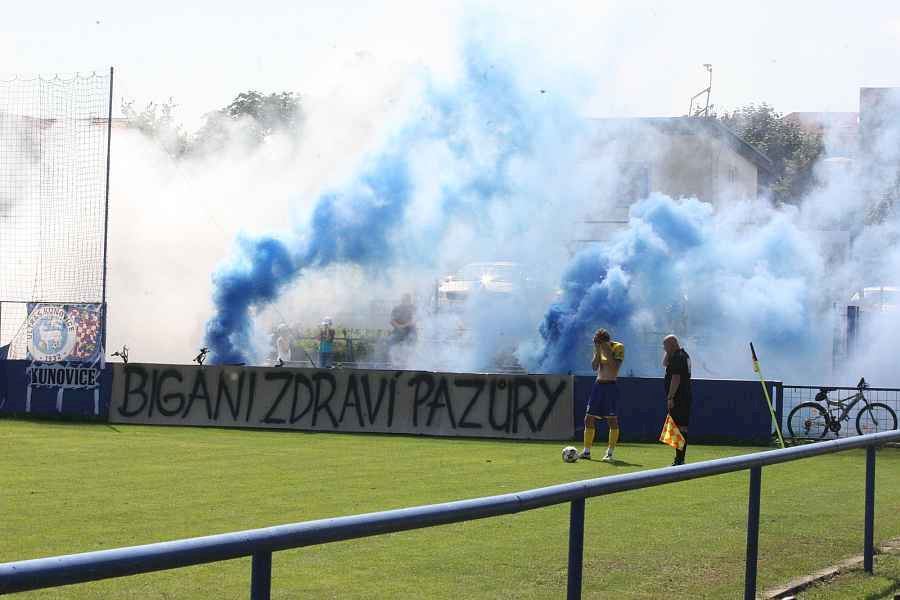 Není policie, nejsou problémy! Paráda! Derby v 1.A třídě nabídlo fanatizmus, mraky pyra a fanoušek slavil rozhodující gól vběhnutím na hřiště se světlicí v ruce. Prostě všichni se bavili. Kunovice vyhrály nad Starým Městem 2:1 a utkání sledovalo 505 diváků.