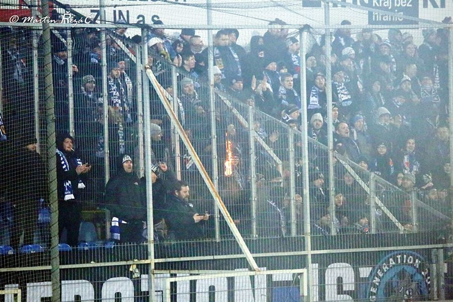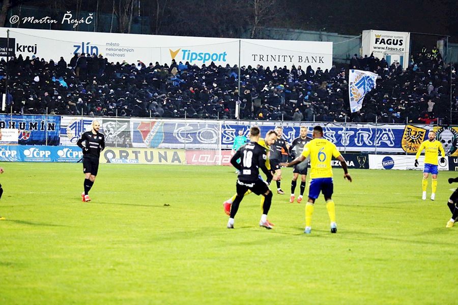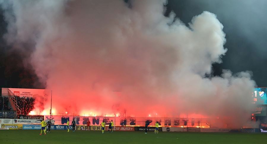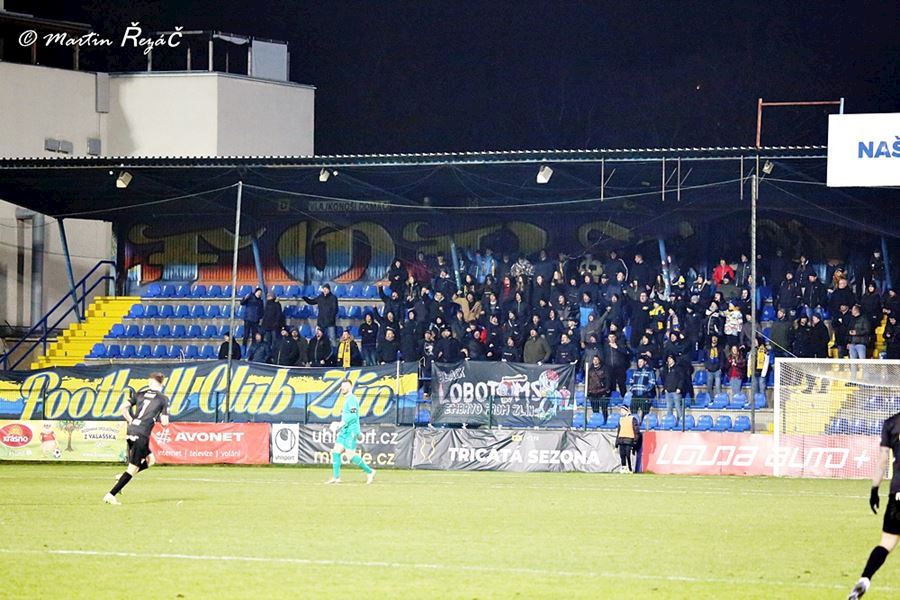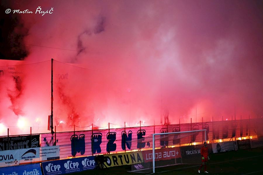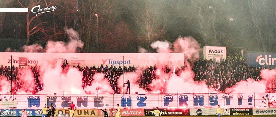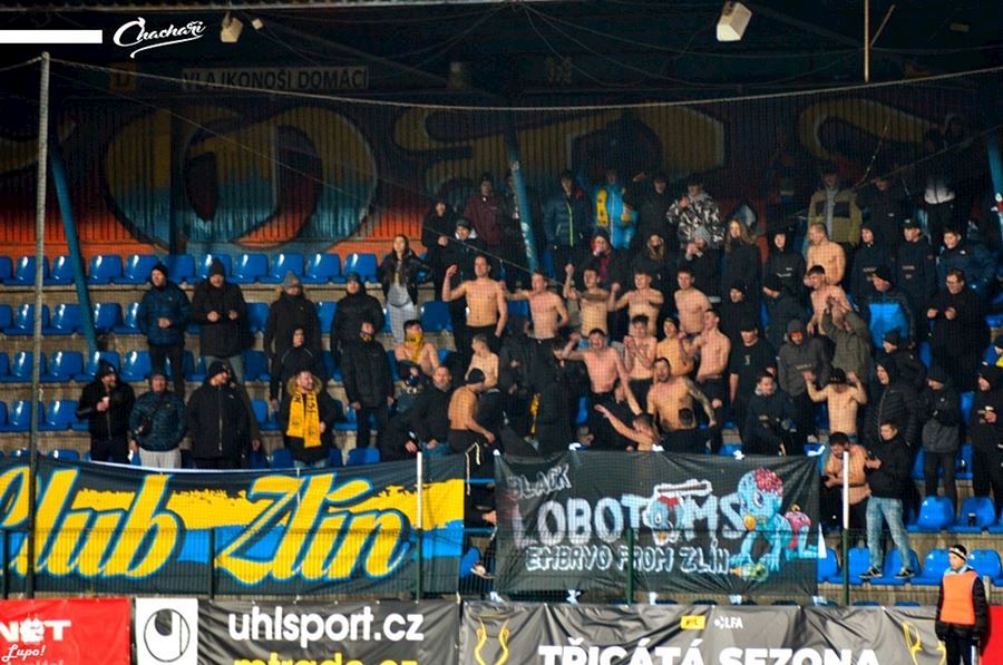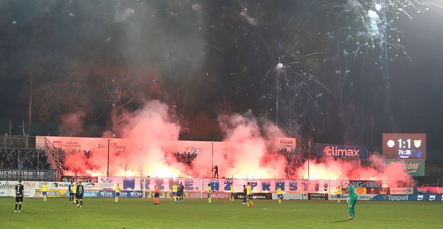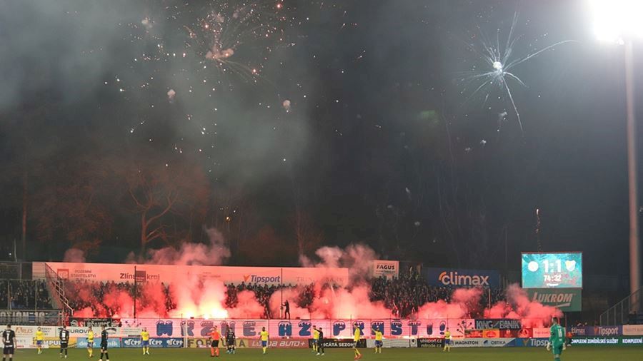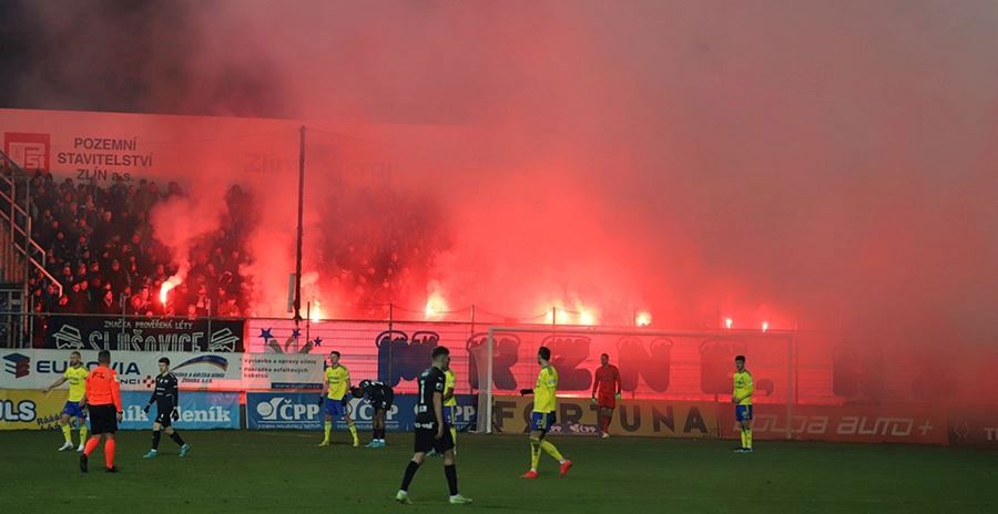 Ohňostroj P*ČO! Mrzne až praští! Chachaři se ve Zlíně zahřáli posvém. Pyro nechybělo ani v domácím sektoru otužilců. Remízové utkání mezi Zlínem a Baníkem sledovalo 4.237 diváků.