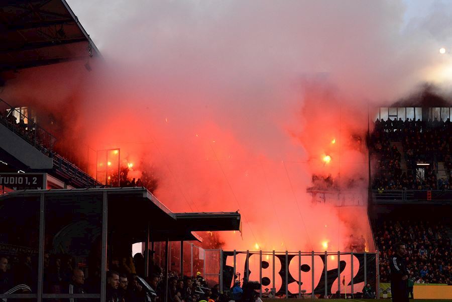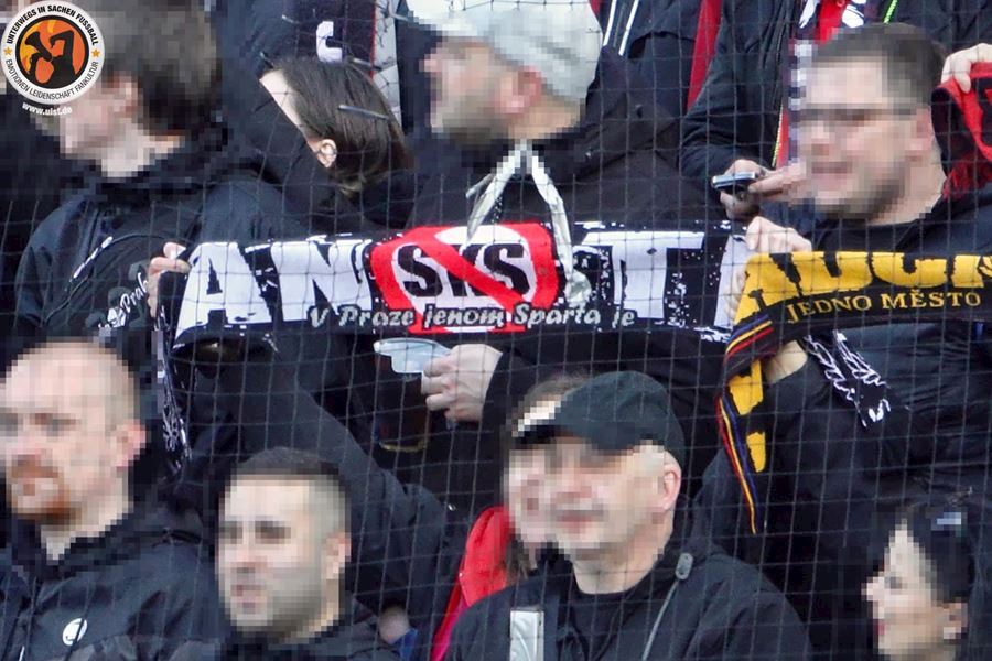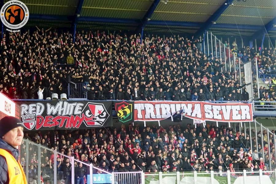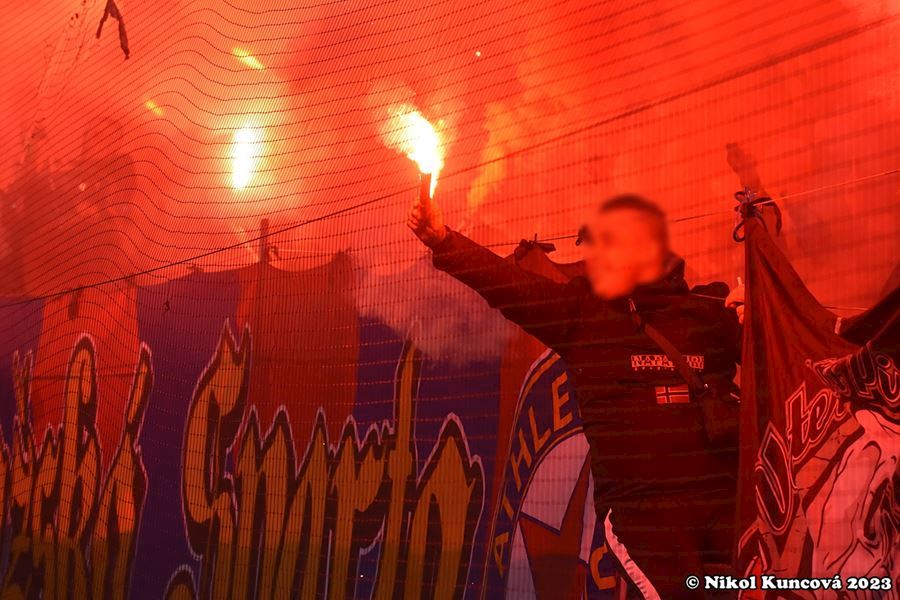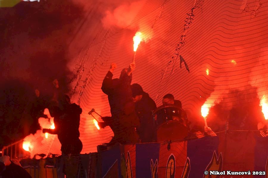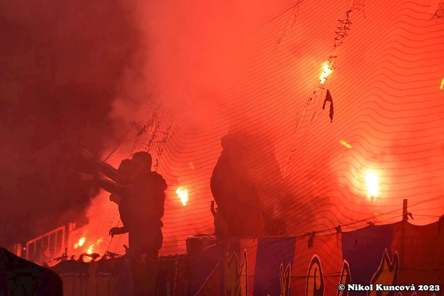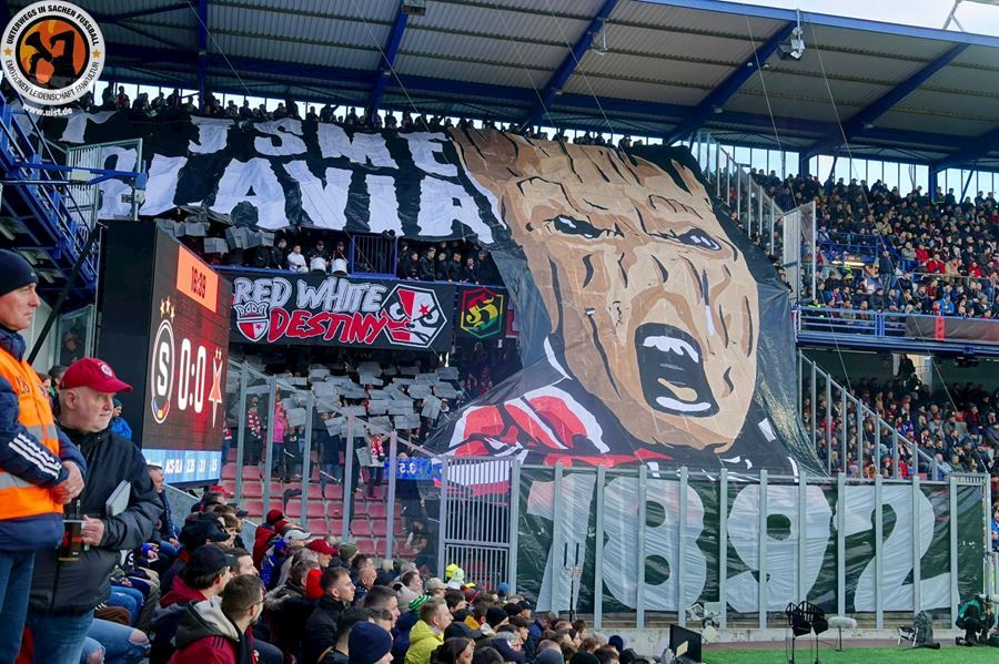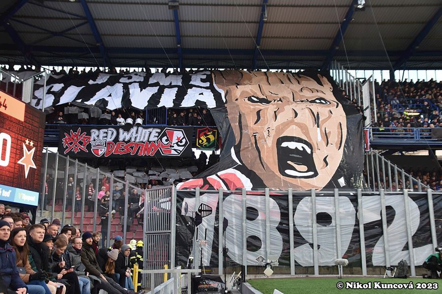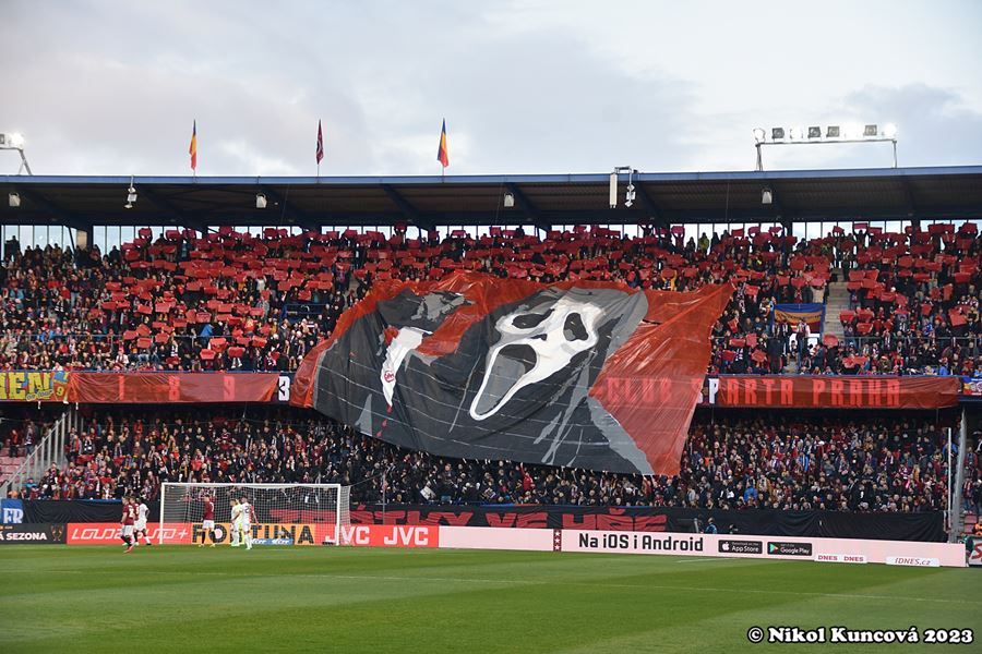 Na dnešní zápas jsme měli na úvod připravené velké tematické choreo "ZPÁTKY VE HŘE”. Plachta o rozměrech 21x14m s motivem Vřískota se povedla namalovat na výbornou a už zbývala jen prezentace spuštěním z horního patra. Bohužel párkožrouti a sedící diváci měli jiné plány a plachta byla na několika místech potrhána a následně poslána dolů. S choreografiemi se tak pro příště budeme muset opět uskromnit jen v našem malém sektoru.