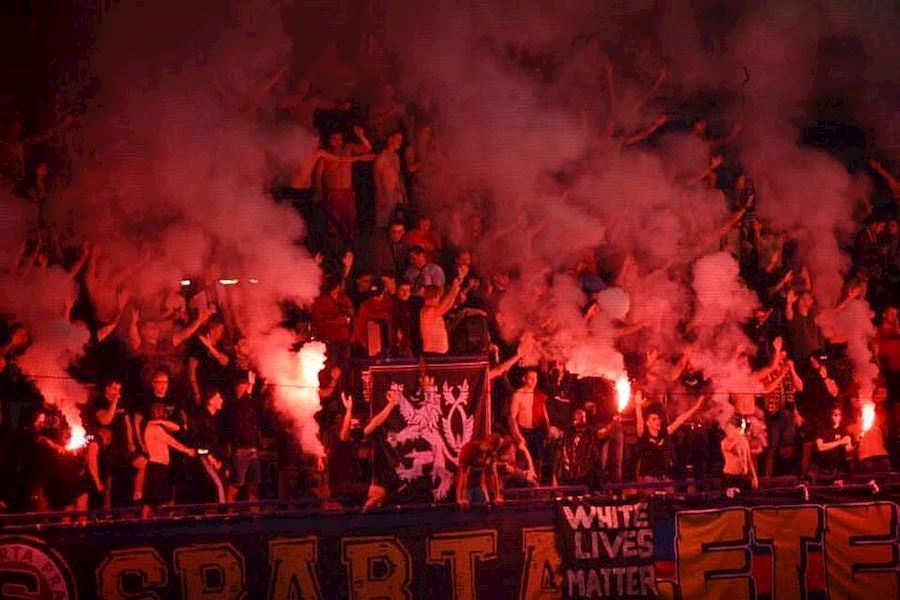 Výhra Sparty nad Plzní okořeněná pyrem. V hledišti nápis White lives matter...