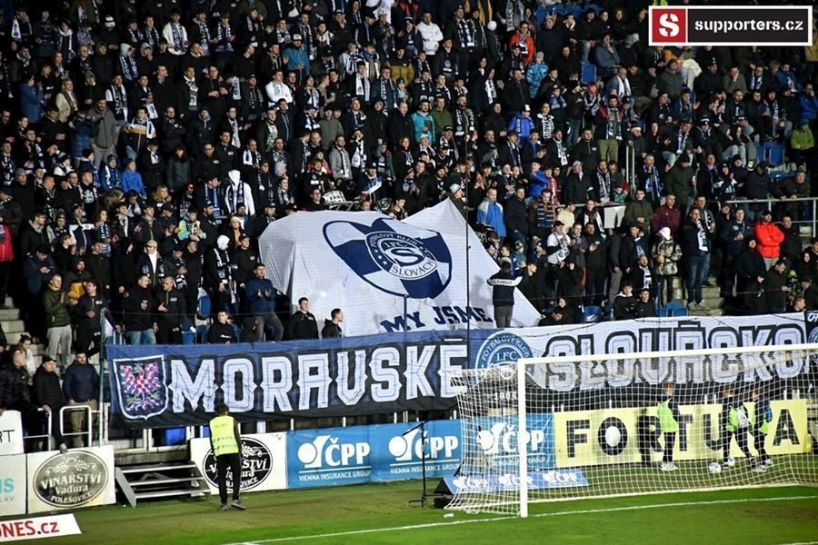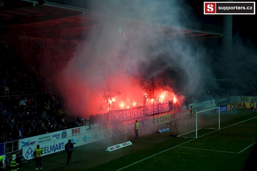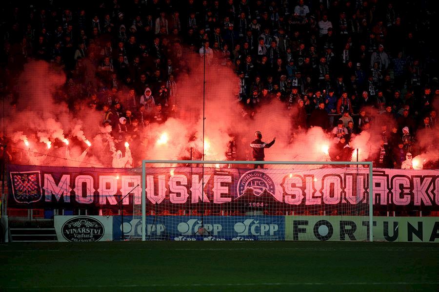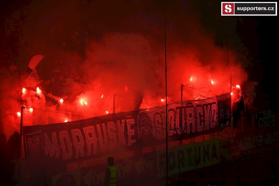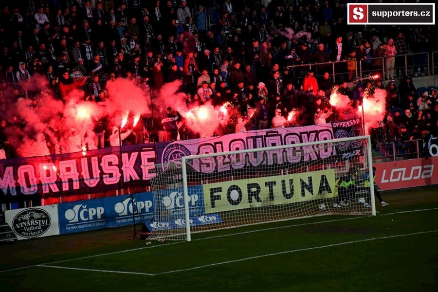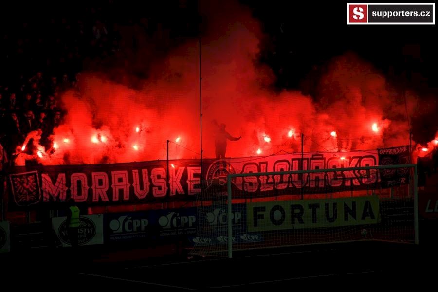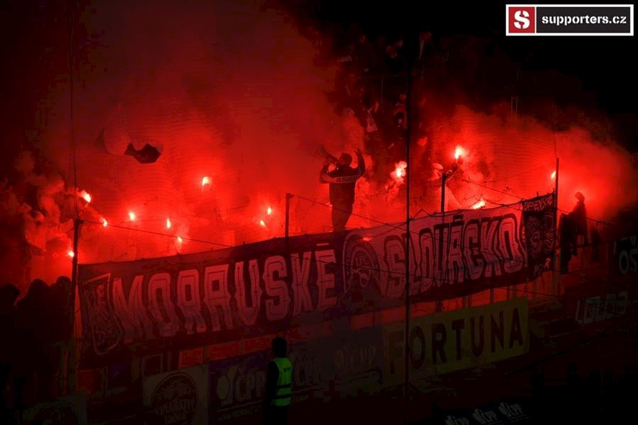 Vyprodané utkání na Slovácku s výbornou atmosférou z obou stran. Z výhry se radují fanoušci Sparty, a tak si domácí fanoušci dělají radost alespoň pyrotechnikou...