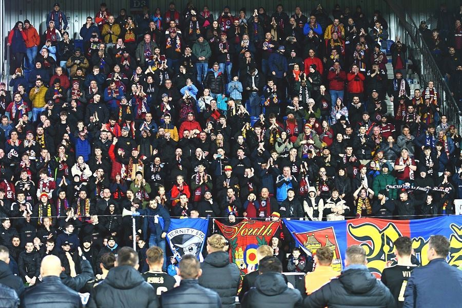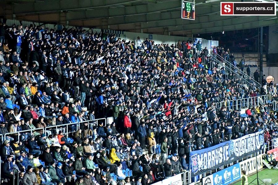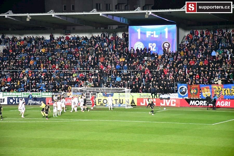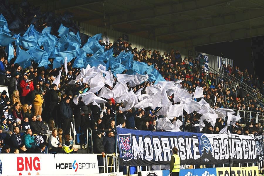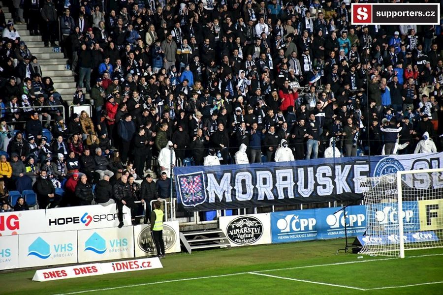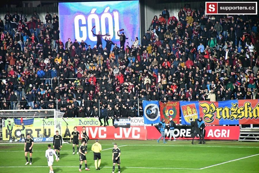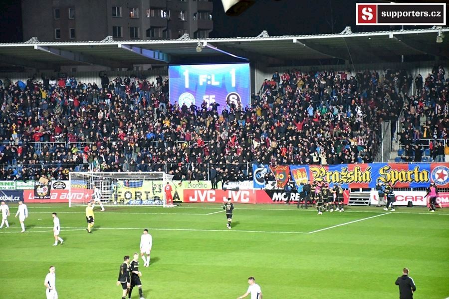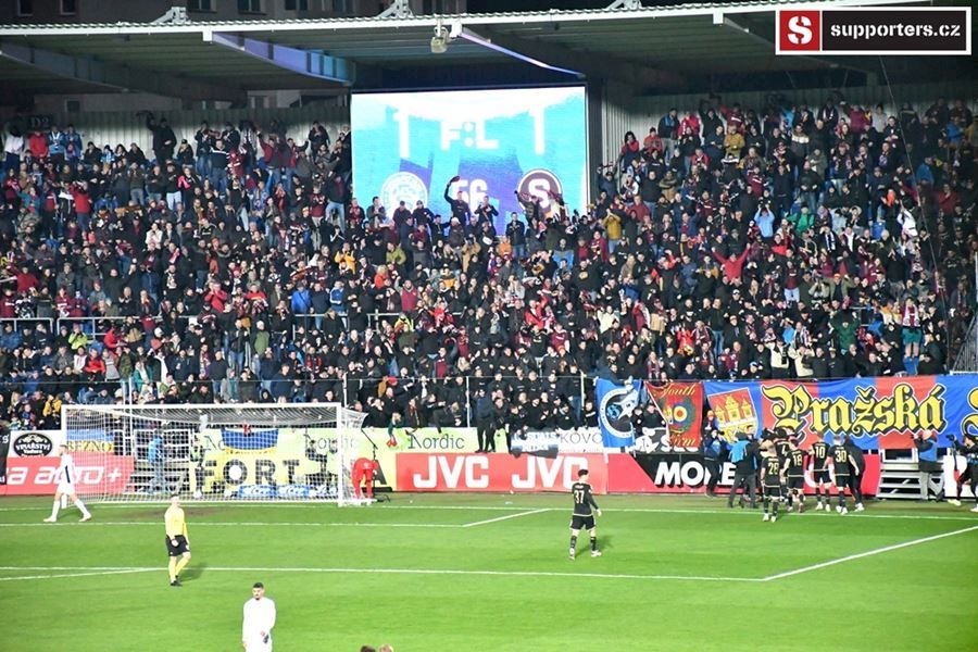 Vyprodané utkání na Slovácku s výbornou atmosférou z obou stran. Z výhry se radují fanoušci Sparty, a tak si domácí fanoušci dělají radost alespoň pyrotechnikou...