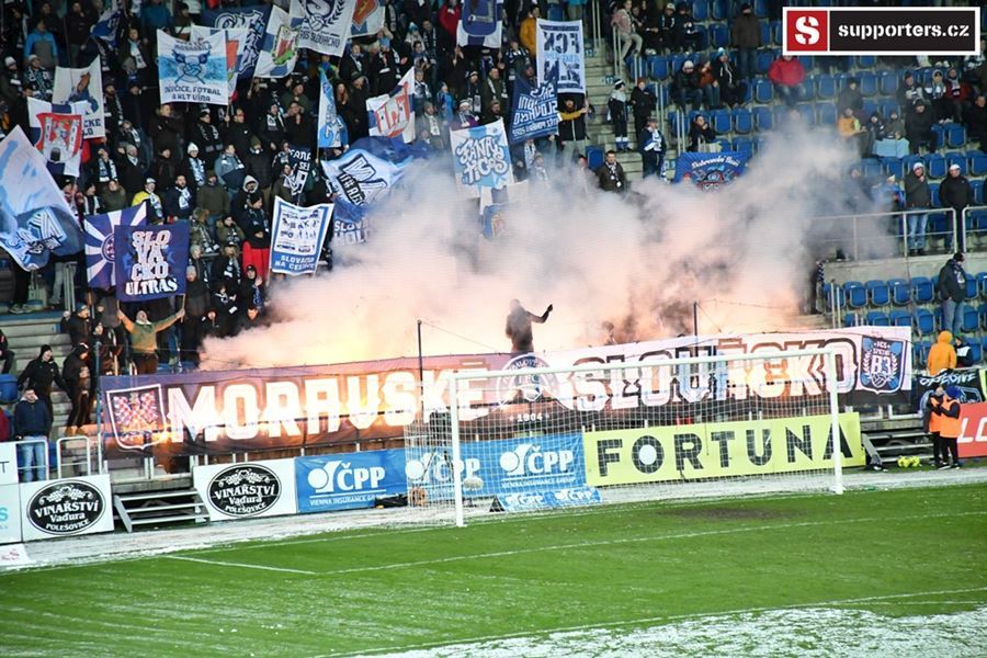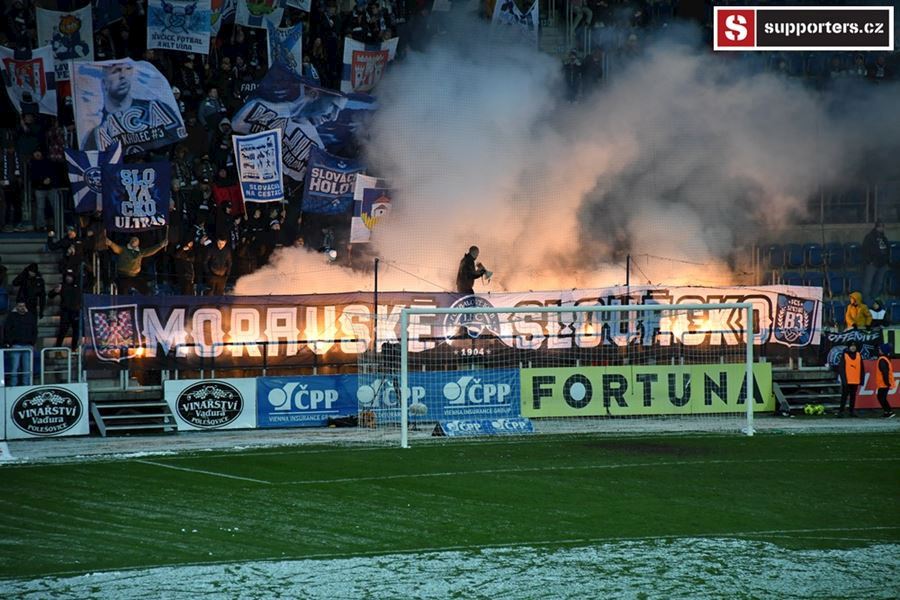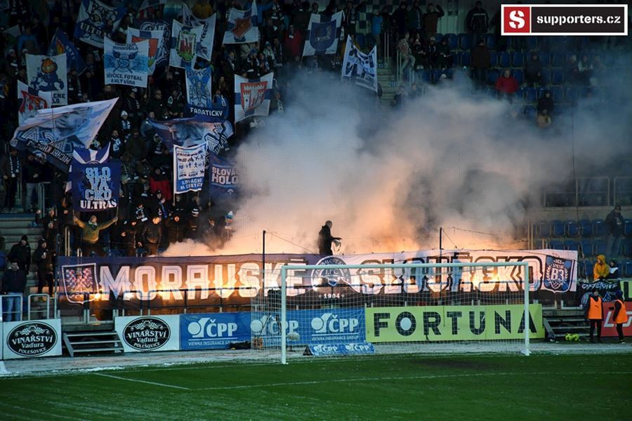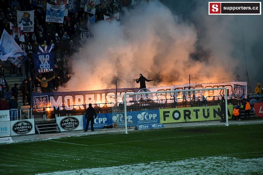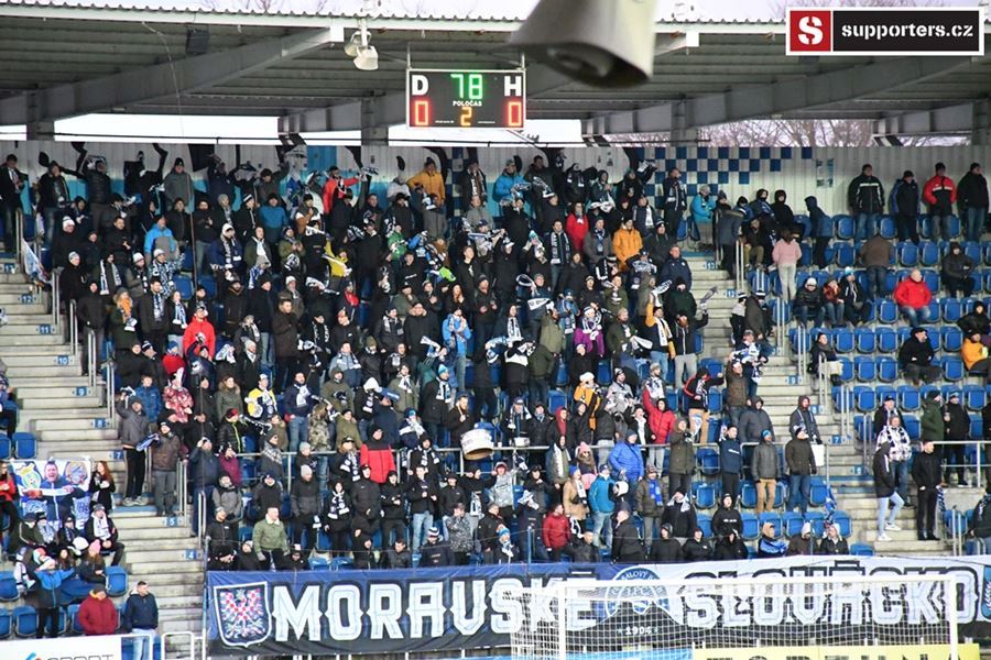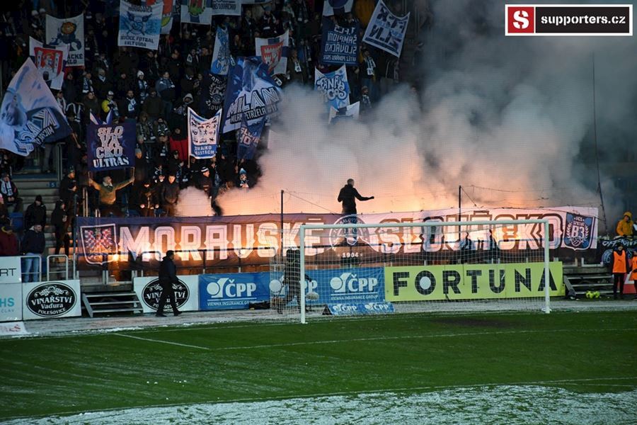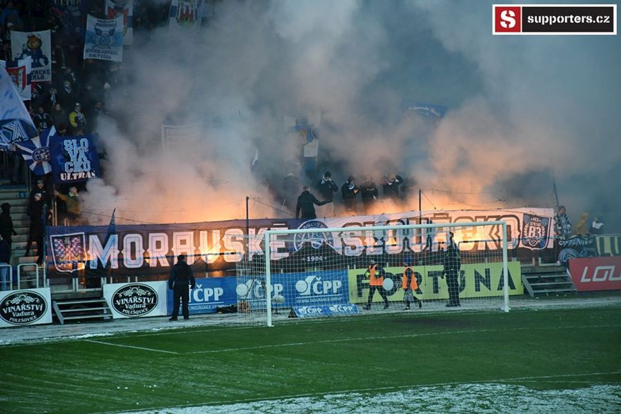 Moravské derby mezi Slováckem a olomouckou Sigmou sledovalo 2.812 diváků. Branky se fanoušci nedočkali, a tak se v zimě, větru a sněhové bouři zahřáli alespoň odpálenou pyrotechnikou za novou vlajkou - Moravské Slovácko.